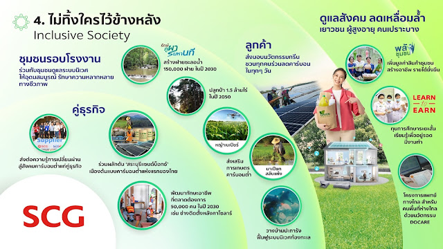 4) Inclusive Society to invite everyone in the supply chain to transition together towards a low-carbon society by promoting the 'Saraburi Sandbox, Thailand’s first low-carbon model city,' to understand the success factors and limitations in transitioning Thailand into a low-carbon society. This initiative promotes 'low-carbon agriculture,' such as practicing alternate wetting and drying in paddy fields and planting Napier grass, an energy crops for renewable energy use. Furthermore, SCG is creating a 'Big Brothers for SMEs' network in Saraburi Province to share knowledge with entrepreneurs on transitioning to a low-carbon society, covering clean energy, green innovations, and seeking funding sources. This includes 'developing in-demand professional skills' where SCG aims to support 50,000 individuals by 2030 to enhance Thai labor skills for secure employment and reduce inequality, including for solar roof installation and maintenance handymen and draftsmen using Building Information Modeling (BIM) software. In addition, SCG collaborates with communities to 'preserve rich ecosystems and biodiversity' through projects like the Conserving Environments from the Mountain through the Sea, aiming to plant 1.5 million rai of trees by 2050, which will absorb more than 2 million tons of carbon dioxide per year, passing on sustainability to future generations.”