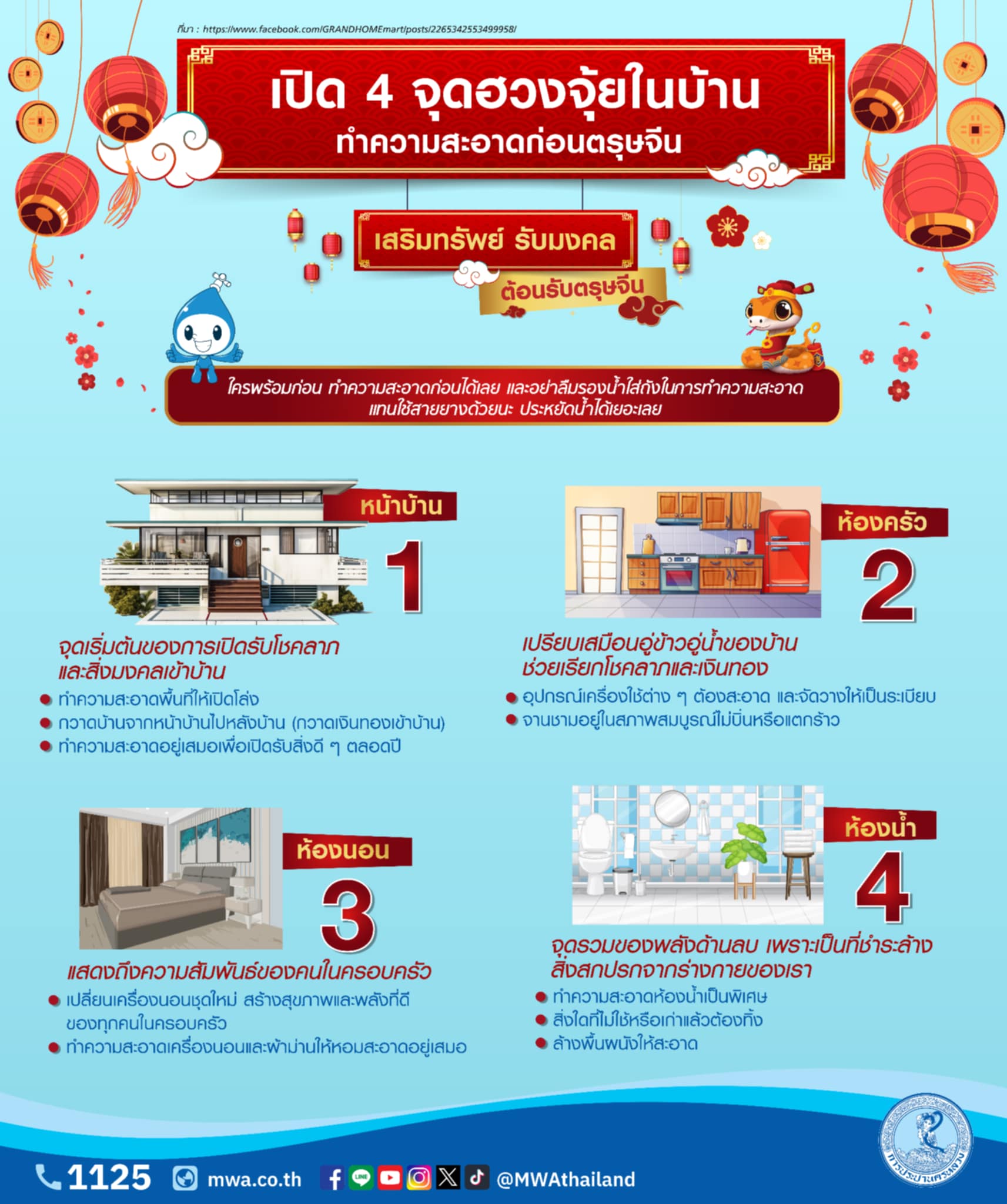 การประปานครหลวง (กปน.) เปิด 4 จุดฮวงจุ้ยในบ้าน ทำความสะอาดก่อนตรุษจีน ทั้งหน้าบ้าน ห้องครัว ห้องนอน และห้องน้ำ