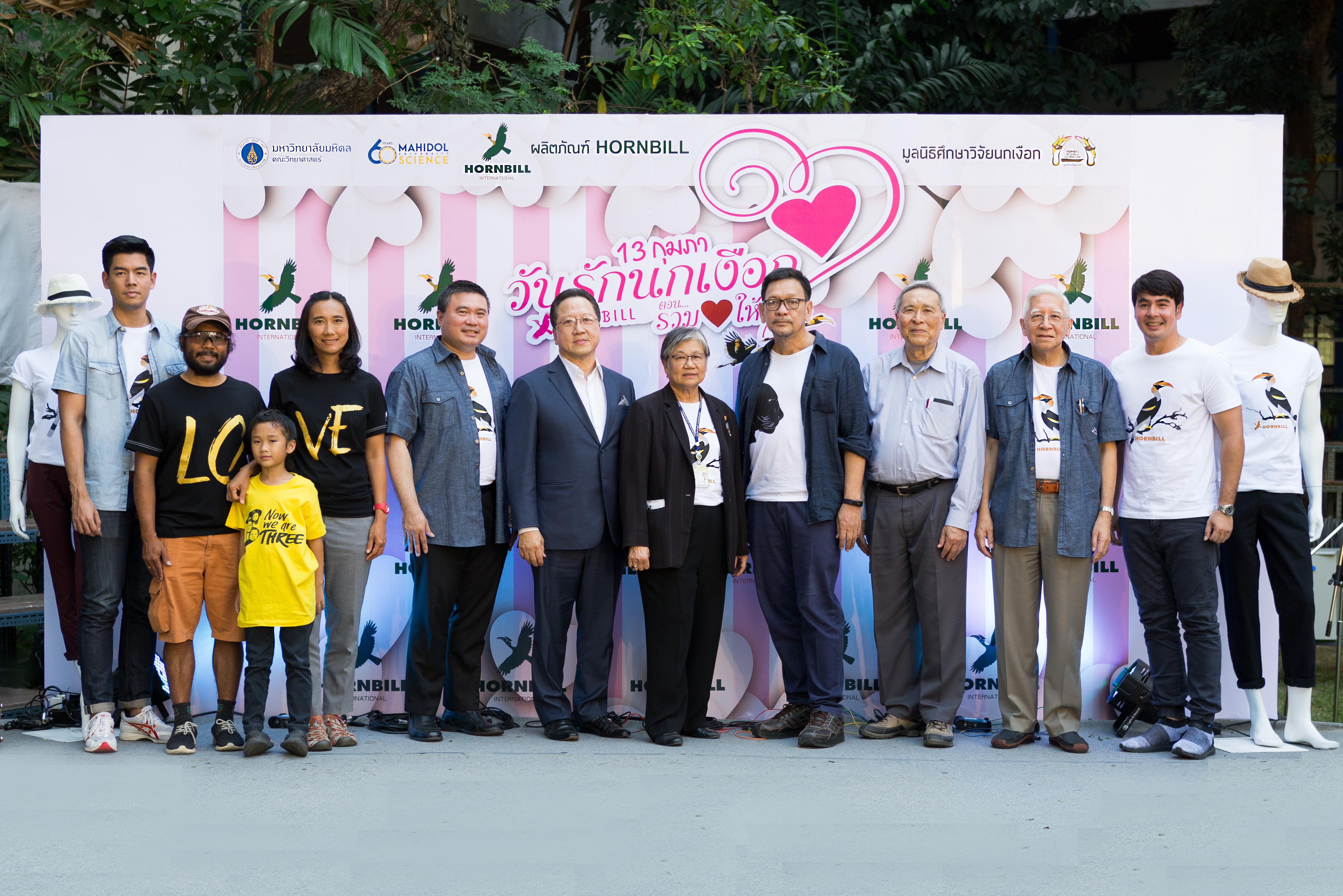 ผลิตภัณฑ์เครื่องแต่งกายคู่รัก HORNBILL INTERNATIONAL (ฮอนบิลล์ อินเตอร์เนชั่นแนล) บริษัท ไอ.ซี.ซี. อินเตอร์เนชั่นแนล จำกัด (มหาชน) ร่วมกับ มูลนิธิศึกษาวิจัยนกเงือก คณะวิทยาศาสตร์ มหาวิทยาลัยมหิดล จัดกิจกรรม “วันรักนกเงือก” ในคอนเซ็ปต์ “รวมใจให้นกเงือก” โดยได้รับเกียรติ (จากซ้าย) โน้ต - วัชรบูล ลี้สุวรรณ , เจริญ – อรวรรณ - เย็นตา โอทอง , รองศาสตราจารย์ ดร.สิทธิวัฒน์ เลิศศิริ , บุญชัย เบญจรงคกุล , ศาสตราจารย์เกียรติคุณ ดร. พิไล พูลสวัสดิ์ , สมพล ชัยสิริโรจน์ , ผู้ช่วยศาสตราจารย์ ดร.ประดน จาติกวณิช , ดร. วรพัฒน์ อรรถยุกติ และ นิธิ สมุทรโคจร ขึ้นถ่ายภาพร่วมกันเป็นที่ระลึก สำหรับกิจกรรมที่จัดขึ้นในปี 2561 นี้ เพื่อหารายได้สบทบทุน “มูลนิธิศึกษาวิจัยนกเงือก” คณะวิทยาศาสตร์ มหาวิทยาลัยมหิดล (ถนนพระราม 6)