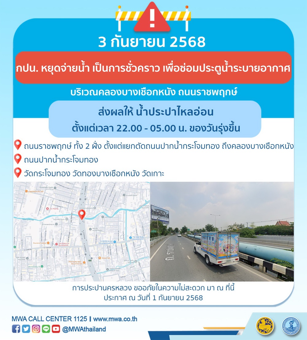 การประปานครหลวง (กปน.) ขอแจ้งให้ทราบว่า จะดำเนินการซ่อมประตูน้ำระบายอากาศ ในพื้นที่บริเวณคลองบางเชือกหนัง ถนนราชพฤกษ์ เพื่อให้ประชาชนได้รับบริการน้ำประปาอย่างเพียงพอและทั่วถึง จึงมีความจำเป็นต้องหยุดจ่ายน้ำ เป็นการชั่วคราว ในคืนวันพุธที่ 3 กันยายน 2568 ตั้งแต่เวลา 22.00 – 05.00 น. ของวันรุ่งขึ้น โดยระหว่างดำเนินการ ส่งผลให้ น้ำประปาไหลอ่อน ในพื้นที่ดังต่อไปนี้