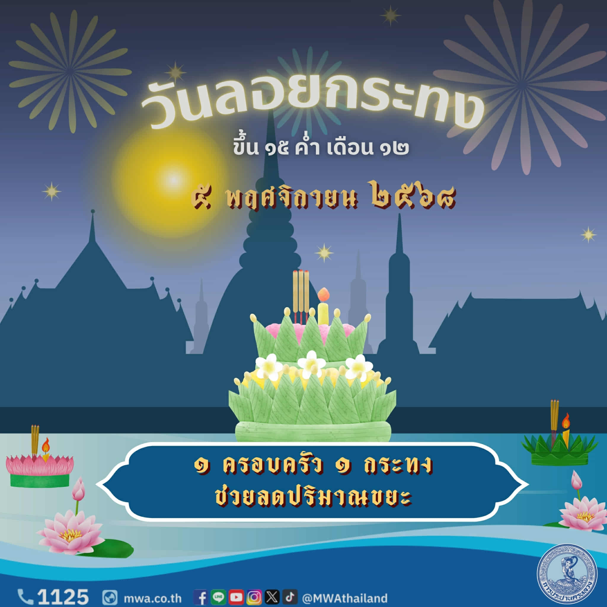 การประปานครหลวง ขอเชิญชวนร่วมสืบสานประเพณีลอยกระทงอย่างไทย ภายใต้แนวคิด “ลอยกระทง ไท ไทย คารวาลัย พระแม่ของแผ่นดิน”