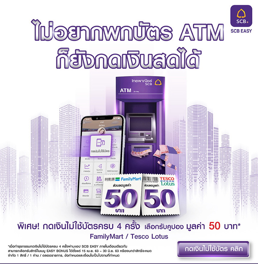 เลือกรับฟรี!คูปอง FamilyMart หรือ Tesco Lotus มูลค่า 50บ เพียงทำรายการกดเงินไม่ใช้บัตรผ่าน EASY APP ครบ 4 ครั้งภายในเดือนเดียวกัน