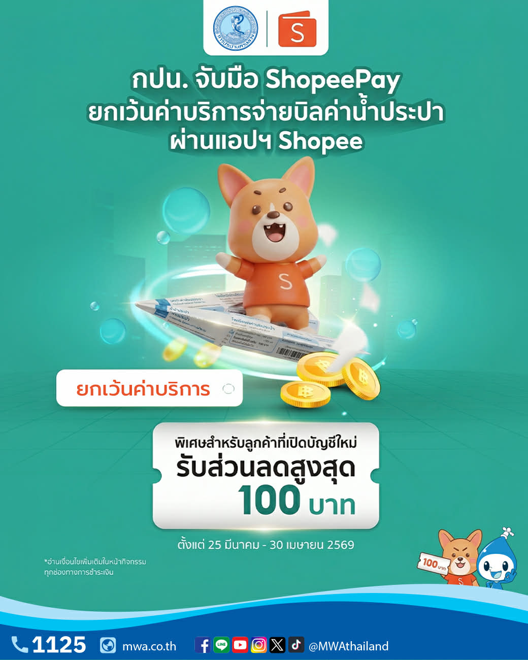 กปน. จับมือ ShopeePay ยกเว้นค่าบริการจ่ายบิลค่าน้ำประปา ผ่านแอปฯ Shopee พิเศษสำหรับลูกค้าที่เปิดบัญชีใหม่ รับส่วนลดสูงสุด 100 บาท ตั้งแต่ บัดนี้ ถึง 30 เม.ย. 69