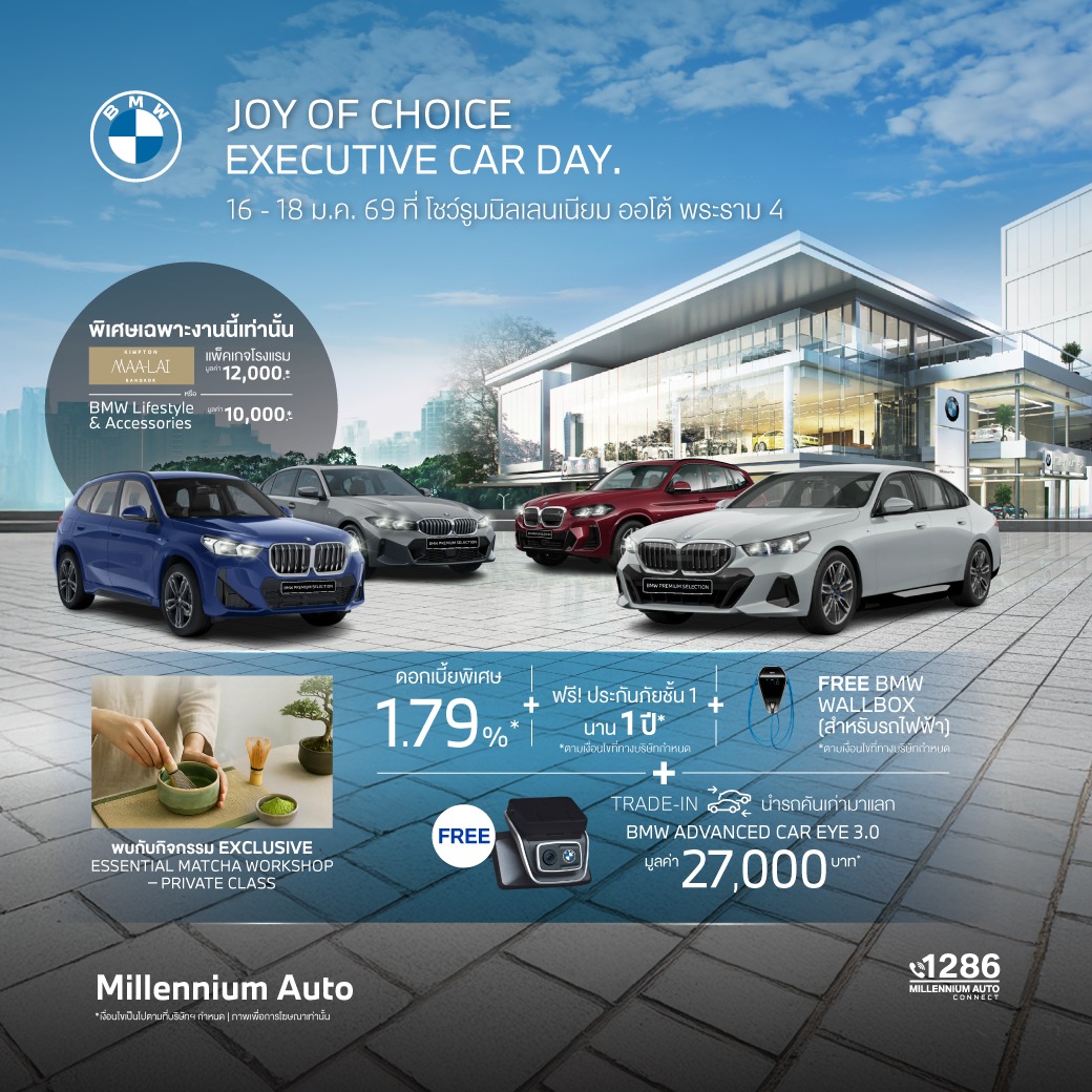 บริษัท มิลเลนเนียม ออโต้ กรุ๊ป จำกัด ผู้จำหน่ายรถยนต์ บีเอ็มดับเบิลยู อย่างเป็นทางการในประเทศไทย ภายใต้บริษัท มิลเลนเนียม กรุ๊ป คอร์ปอเรชั่น (เอเชีย) จำกัด (มหาชน) หรือ MGC-ASIA มิลเลนเนียม ออโต้ ประเดิมปีใหม่ด้วยแนวคิด The First of Joy 2026 ส่งมอบความสุขตลอดเดือนมกราคม จัดกิจกรรม ‘JOY OF CHOICE – EXECUTIVE CAR DAY’ จัดทัพยนตรกรรมผู้บริหาร BMW Premium Selection ที่ผ่านการตรวจสอบและรับรองคุณภาพตามมาตรฐาน บีเอ็มดับเบิลยู กรุ๊ป ประเทศไทย ให้ลูกค้าได้เป็นเจ้าของภายใต้ข้อเสนอและราคาสุดพิเศษ พร้อมส่งมอบทันที ตอบโจทย์ทั้งการใช้งาน ภาพลักษณ์ และไลฟ์สไตล์ในทุกวัน ระหว่างวันที่ 16–18 มกราคม 2569 ณ โชว์รูม บีเอ็มดับเบิลยู มิลเลนเนียม ออโต้ พระราม 4