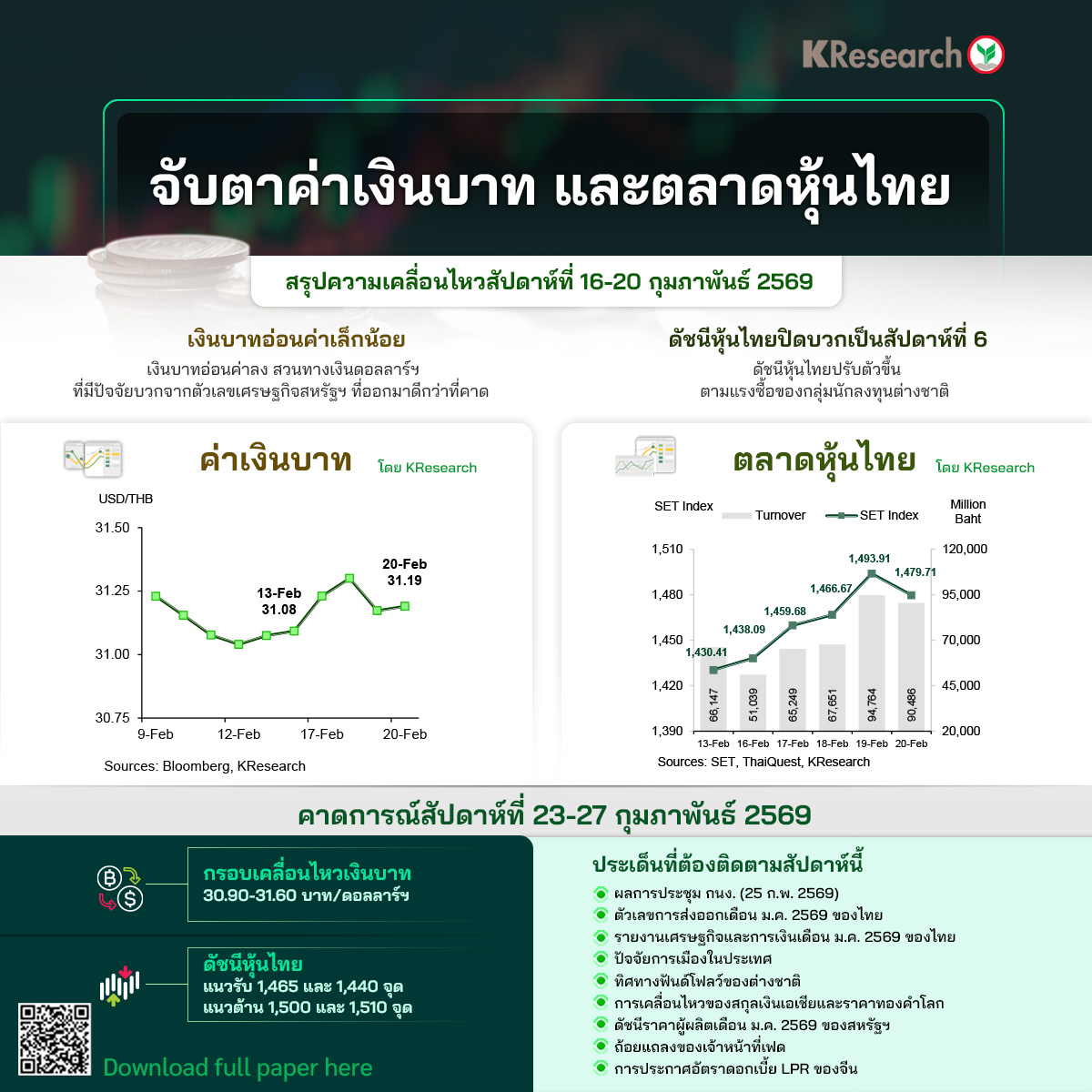 • สัปดาห์ระหว่างวันที่ 23-27 ก.พ. 2569 KBank คาดกรอบการเคลื่อนไหวของเงินบาทที่ 30.90-31.60 บาทต่อดอลลาร์ฯ ปัจจัยที่ต้องติดตาม ได้แก่ ตัวเลขการส่งออกเดือนม.ค. ผลการประชุม กนง. (25 ก.พ.) รายงานเศรษฐกิจและการเงินเดือนม.ค. ของไทย ปัจจัยการเมืองในประเทศ ฟันด์โฟลว์ของต่างชาติ การเคลื่อนไหวของสกุลเงินเอเชียและราคาทองคำในตลาดโลก ดัชนีราคาผู้ผลิตเดือนม.ค. ของสหรัฐฯ ถ้อยแถลงของเจ้าหน้าที่เฟด การประกาศอัตราดอกเบี้ย LPR ของจีน และอัตราเงินเฟ้อเดือนม.ค. ของยูโรโซน