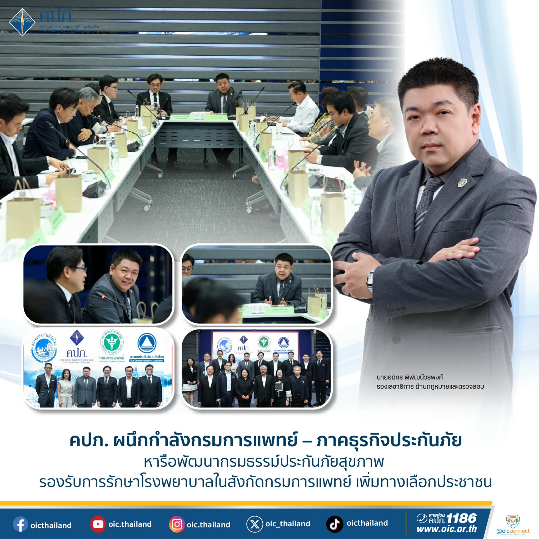เมื่อวันที่ 1 เมษายน 2569 สำนักงานคณะกรรมการกำกับและส่งเสริมการประกอบธุรกิจประกันภัย (สำนักงาน คปภ.) ร่วมกับกรมการแพทย์ สมาคมประกันชีวิตไทย และสมาคมประกันวินาศภัยไทย จัดประชุมหารือแนวทางการพัฒนากรมธรรม์ประกันภัยสุขภาพ เพื่อรองรับการเข้ารับการรักษาในโรงพยาบาลของรัฐในสังกัดกรมการแพทย์ ณ ห้องประชุมสถาบันวิทยาการประกันภัยระดับสูง สำนักงาน คปภ.