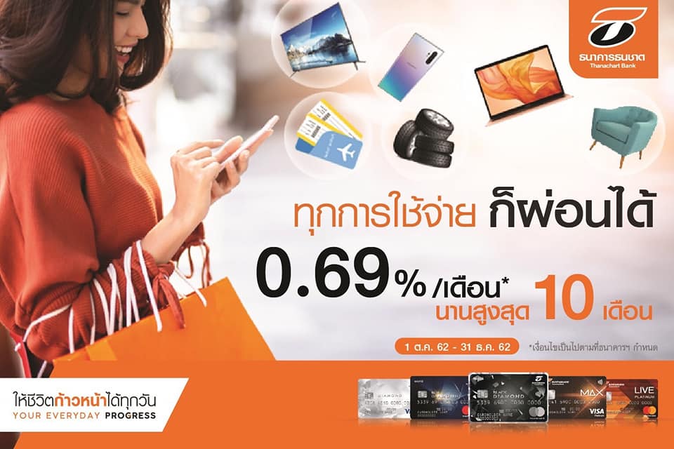 บัตรเครดิตธนชาต ช่วยแบ่งเบาลูกค้าในทุกการใช้จ่าย แบ่งชำระได้ ดอกเบี้ยเพียง 0.69% นานสูงสุด 10 เดือน
