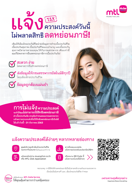 ทั้งนี้ ตามหลักเกณฑ์ที่กรมสรรพากรกำหนด ให้ผู้มีเงินได้ที่ต้องการขอใช้สิทธิลดหย่อนภาษีเงินได้บุคคลธรรมดาจากเบี้ยประกันชีวิต เบี้ยประกันสุขภาพ เบี้ยประกันชีวิตแบบบำนาญ และเบี้ยประกันสุขภาพบิดามารดา ตั้งแต่ วันที่ 1 มกราคม 2563 เป็นต้นไปนั้น ผู้มีเงินได้ต้องแจ้งความประสงค์ใช้สิทธิลดหย่อนภาษีเงินได้บุคคลธรรมดามายังบริษัทประกันชีวิต เพื่อให้บริษัทฯ นำส่งข้อมูลการชำระเบี้ยประกันภัยด้วยรูปแบบอิเล็กทรอนิกส์ให้กับกรมสรรพากร (การไม่แจ้งความประสงค์จะทำให้ลูกค้าไม่สามารถใช้สิทธิลดหย่อนภาษีค่าเบี้ยประกันภัย ตามข้อกำหนดของกรมสรรพากรแจ้งความประสงค์เพื่อใช้สิทธิลดหย่อนภาษีเงินได้) บริษัทฯ จึงได้อำนวยความสะดวกให้กับลูกค้า ในการแจ้งความประสงค์ผ่านขั้นตอนที่ไม่ยุ่งยากและหลากหลายช่องทาง อาทิ ศูนย์บริการลูกค้าเมืองไทยประกันชีวิตทุกสาขาทั่วประเทศ (ในวันและเวลาทำการ) หรือช่องทางออนไลน์ผ่านเว็บไซต์ www.muangthai.co.th หรือ แอปพลิเคชัน MTL Click รวมถึงสามารถดาวน์โหลดแบบฟอร์มแจ้งความประสงค์ ผ่านเว็บไซต์ www.muangthai.co.th หรือ แอปพลิเคชัน MTL Click เพื่อกรอกรายละเอียดแล้วส่งมายังบริษัทฯ โดยสามารถแจ้งความประสงค์ได้แล้วตั้งแต่วันนี้ วันที่ 31 ธันวาคม 2563