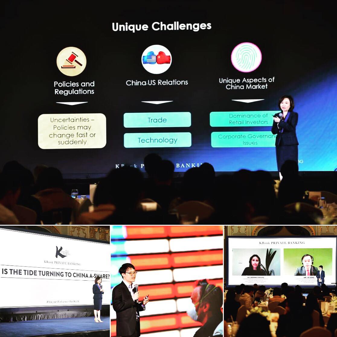 นางสาวศิริพร สุวรรณการ Managing Director – Financial Advisory Head Private Banking Group ธนาคารกสิกรไทย กล่าวว่าเคแบงก์ ไพรเวทแบงกิ้ง และบลจ. กสิกรไทย มองเห็นศักยภาพของตลาดหุ้นจีน A-Shares ที่จะเป็นแหล่งสร้างผลตอบแทนที่ดีในระยะยาวให้กับนักลงทุนได้ รวมทั้งการเปิดเสรีตลาดการเงินอย่างต่อเนื่อง และการที่ Morgan Stanley Capital International (MSCI) บริษัทจัดทำดัชนีราคาหุ้นชั้นนำของโลก ได้รวมหุ้นจีน A-Shares ในการคำนวณดัชนีตลาดเกิดใหม่ (MSCI Emerging Markets Index) นั่นหมายถึง การเปิดประตูให้นักลงทุนนอกประเทศจีน ทำให้มีทั้งสภาพคล่องและความเชื่อมั่นมากขึ้น