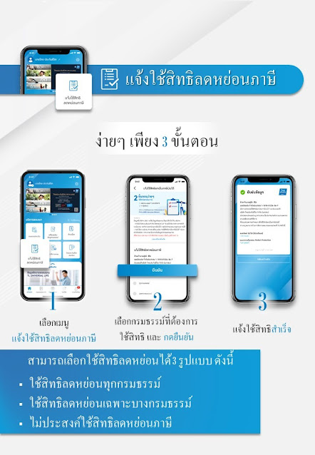 แอปพลิเคชัน ไทยประกันชีวิต โดยเปิดที่หน้าหลัก เลือกเมนู “แจ้งใช้สิทธิลดหย่อนภาษี” ซึ่งจะแสดงข้อมูลกรมธรรม์ให้เลือก สามารถเลือก “กรมธรรม์ที่ต้องการใช้สิทธิลดหย่อนภาษี” หรือ “เลือกทั้งหมด” โดยบริษัทฯ จะดำเนินการจัดส่งข้อมูลล่าสุดตามที่ผู้เอาประกันภัยได้แจ้งไว้ นอกจากนี้ผู้เอาประกันภัยยังสามารถดาวน์โหลดหนังสือรับรองการชำระเบี้ยฯ ผ่านแอปพลิเคชัน ไทยประกันชีวิตได้อีกด้วย