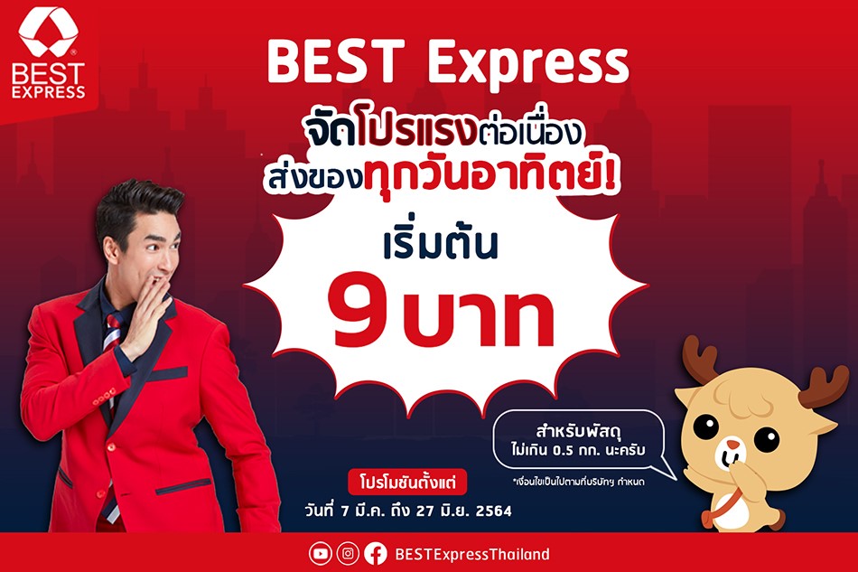 BEST Express (เบสท์ เอ็กซ์เพรส) ผู้ให้บริการ รับ-ส่ง พัสดุด่วนทั่วไทย ไปไหน ไปกัน Everywhere, with you ออกโปรโมชั่นส่งพัสดุทั่วไทยต้อนรับเดือนมีนาคม 2564 ด้วยราคาพิเศษส่งพัสดุเฉพาะวันอาทิตย์ เริ่มต้นที่ 9 บาท น้ำหนักไม่เกิน 0.5 กิโลกรัม (เฉพาะส่งพัสดุภายในกรุงเทพฯ ปริมณฑลและต่างจังหวัด ส่งมากรุงเทพฯ ปริมณฑล) กับโปรโมชั่นเริ่มต้นที่ 12 บาท น้ำหนักไม่เกิน 0.5 กิโลกรัม (เฉพาะส่งพัสดุจากกรุงเทพฯ ปริมณฑลไปต่างจังหวัด ส่งภายในจังหวัดและส่งข้ามจังหวัด) โปรโมชั่นเริ่มตั้งแต่วันนี้ – 27 มิถุนายน 2564 ทุกสาขาทั่วประเทศ