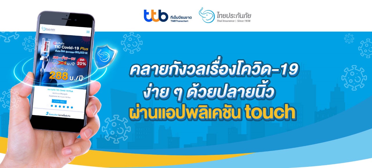 TIC ไทยประกันภัย สานต่อพันธมิตรกับทีเอ็มบีธนชาต (ttb) นำเสนอแผนประกันภัยโควิด-19 บนแอปพลิเคชัน touch ให้ลูกค้าทีเอ็มบีธนชาตเข้าถึงความคุ้มครองได้สะดวกมากขึ้น คลายกังวลจากการติดเชื้อโควิด-19 ด้วย แบบประกันภัย “Covid-19 TIC Freedom” ที่เมื่อตรวจเจอเชื้อโควิด-19 เป็นครั้งแรก รับทันทีสูงสุด 100, 000 บาท* กรณีเจ็บป่วยด้วยภาวะโคม่าหรือระยะสุดท้ายจากเชื้อโควิด-19 รับสูงสุด 300,000 บาท* ค่าเบี้ยประกันภัยเริ่มต้นเพียง 231 บาท* และแบบประกันภัย “TIC Covid-19 Plus” ที่นอกจากคุ้มครองการติดเชื้อโควิด-19 แล้ว ยังขยายความคุ้มครองครอบคลุมถึงกรณีที่มีอาการแทรกซ้อนจากการแพ้วัคซีน จนต้องเข้ารักษาตัวในโรงพยาบาล (IPD) สูงสุด 20,000 บาท* ค่าเบี้ยประกันภัยเริ่มต้นเพียง 288 บาท* ซึ่งค่าเบี้ยประกันภัยนี้ TIC ปรับลดแล้ว 20% ทุกแผนประกัน ลูกค้าที่สนใจสามารถซื้อประกันภัยทั้ง 2 แบบได้แล้ววันนี้ ที่แอปพลิเคชัน touch