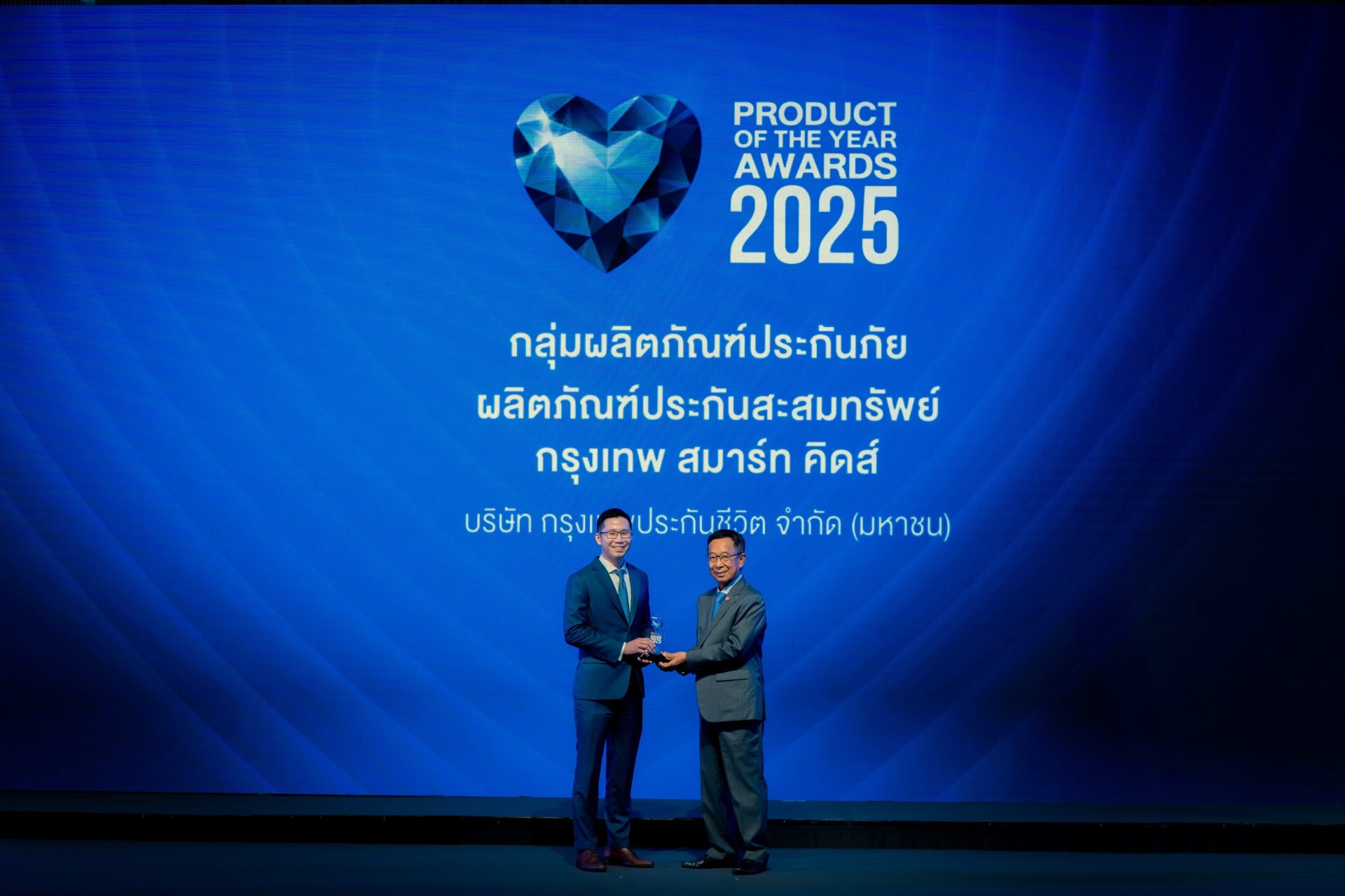 กรุงเทพประกันชีวิต ตอกย้ำความสำเร็จจากผลิตภัณฑ์ประกันสะสมทรัพย์ “กรุงเทพ สมาร์ท คิดส์” ที่สามารถคว้ารางวัล “Product of the Year Awards 2025” ในงานมอบรางวัลสินค้าและบริการแห่งปี 2568 “BUSINESS+ PRODUCT OF THE YEAR AWARDS 2025” ภายใต้แนวคิด “Reaching for the Hearts เข้าถึงใจผู้บริโภค” เพื่อยกย่องและเชิดชูเกียรติให้แก่ผลิตภัณฑ์และบริการที่ได้รับความนิยมจากลูกค้าแห่งปี 2568 ที่ผ่านการวิจัยและวิเคราะห์จากคณะกรรมการผู้ทรงคุณวุฒิ และผ่านการโหวตคัดเลือกจากผู้บริโภค จัดโดย นิตยสาร Business+ ร่วมกับ วิทยาลัยการจัดการ มหาวิทยาลัยมหิดล โดยมี นายทรงพล ปรีดาวุฒิ ผู้อำนวยการอาวุโส ฝ่ายพัฒนาและบริหารผลิตภัณฑ์ บริษัท กรุงเทพประกันชีวิต จำกัด (มหาชน) (ซ้าย) ขึ้นรับรางวัลจาก นายนุรักษ์ มาประณีต องคมนตรี (ขวา) ที่ได้ให้เกียรติเป็น ประธานในพิธี ณ โรงแรมสวิสโฮเต็ล กรุงเทพฯ รัชดา เมื่อเร็วๆ นี้