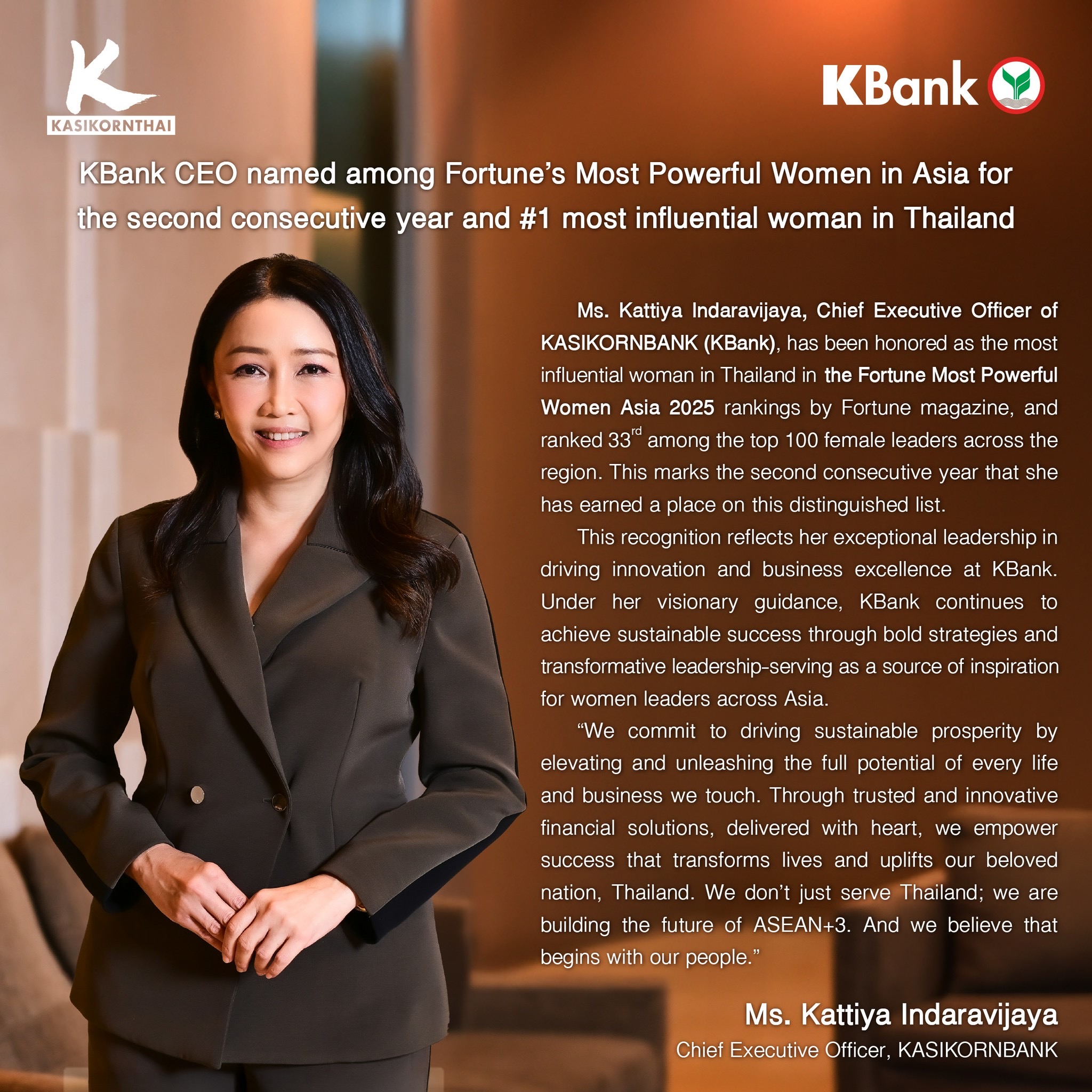 ขัตติยา อินทรวิชัย ประธานเจ้าหน้าที่บริหาร ธนาคารกสิกรไทย ได้รับการยกย่องจากนิตยสาร Fortune ให้ติดอันดับ The Fortune Most Powerful Women Asia 2025 โดยเป็นผู้นำหญิงที่ทรงอิทธิพลสูงสุดอันดับ 1 ของประเทศไทย และเป็นอันดับที่ 33 จาก 100 ผู้นำหญิงทรงอิทธิพลของภูมิภาคเอเชียที่ได้รับการคัดเลือกในปีนี้ ซึ่งเป็นการได้รับคัดเลือกให้อยู่ในรายชื่อผู้นำหญิงที่ทรงอิทธิพลที่สุดในเอเชียเป็นปีที่ 2 ติดต่อกัน