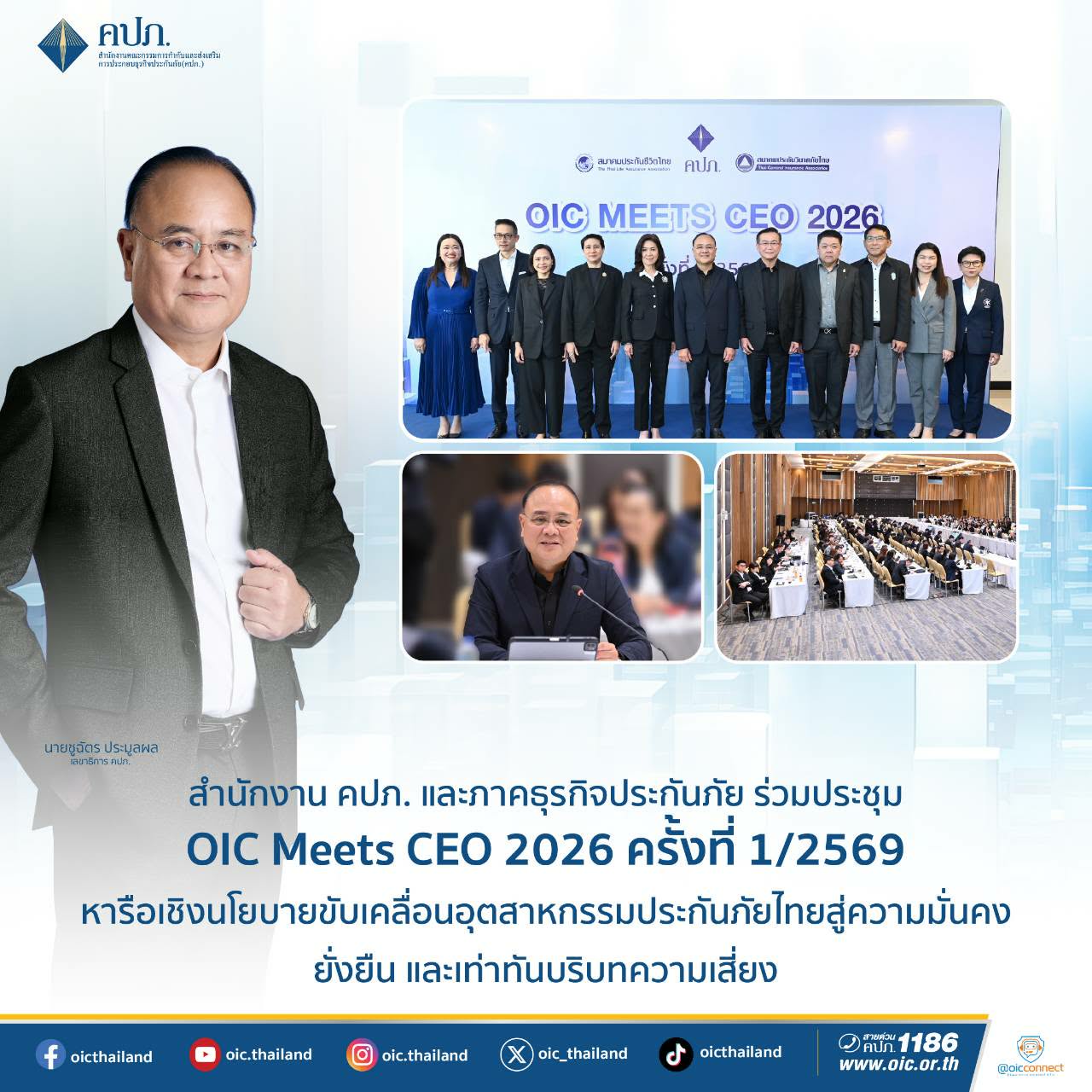 เมื่อวันที่ 5 มกราคม 2569 สำนักงานคณะกรรมการกำกับและส่งเสริมการประกอบธุรกิจประกันภัย (สำนักงาน คปภ.) จัดการประชุมผู้บริหารระดับสูงด้านการประกันภัย “OIC Meets CEO 2026” ครั้งที่ 1/2569 โดยนายชูฉัตร ประมูลผล เลขาธิการคณะกรรมการกำกับและส่งเสริมการประกอบธุรกิจประกันภัย (เลขาธิการ คปภ.) เป็นประธานการประชุม ร่วมกับ นางนุสรา (อัสสกุล) บัญญัติปิยพจน์ นายกสมาคมประกันชีวิตไทย ดร.สมพร สืบถวิลกุล นายกสมาคมประกันวินาศภัยไทย และนายสาระ ล่ำซำ อุปนายกฝ่ายการตลาด สมาคมประกันชีวิตไทย พร้อมด้วยผู้บริหารสำนักงาน คปภ. ผู้บริหารสมาคมประกันชีวิตไทย ผู้บริหารสมาคมประกันวินาศภัยไทย และผู้บริหารบริษัทประกันภัย รวมถึง นายกสมาคมตัวแทนประกันชีวิตและที่ปรึกษาการเงิน และนายกสมาคมนายหน้าประกันภัยไทย เข้าร่วมประชุม ณ ห้องประชุม 421 อาคารอเนกประสงค์ สถาบันวิชาการป้องกันประเทศ กรุงเทพมหานคร