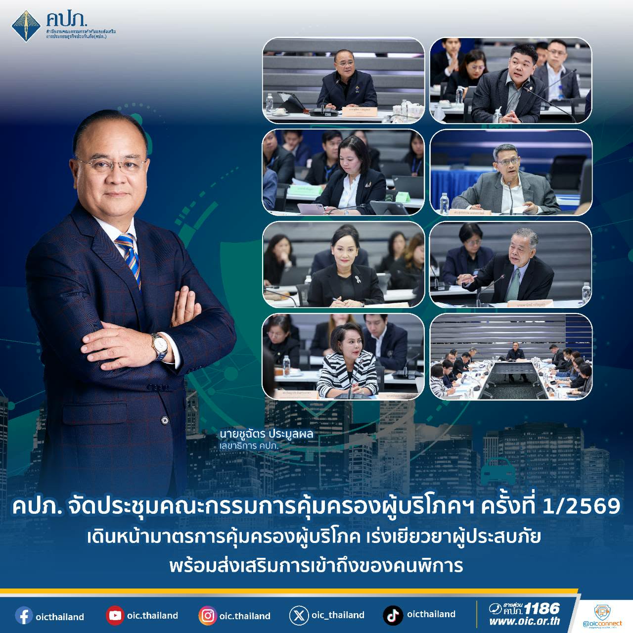 เมื่อวันที่ 26 มกราคม 2569 นายชูฉัตร ประมูลผล เลขาธิการคณะกรรมการกำกับและส่งเสริมการประกอบธุรกิจประกันภัย (เลขาธิการ คปภ.) เป็นประธานการประชุมคณะกรรมการคุ้มครองผู้บริโภคและการมีส่วนร่วมด้านการประกันภัย ครั้งที่ 1/2569 โดยมีคณะกรรมการจากภายนอกและหน่วยงานที่เกี่ยวข้องเข้าร่วมประชุม ประกอบด้วย สมาคมประกันชีวิตไทย สมาคมประกันวินาศภัยไทย สมาคมตัวแทนประกันชีวิตและที่ปรึกษาการเงิน สมาคมนายหน้าประกันภัยไทย สำนักงานคณะกรรมการคุ้มครองผู้บริโภค กรมคุ้มครองสิทธิและเสรีภาพ กรมส่งเสริมและพัฒนาคุณภาพชีวิตคนพิการ กรมประชาสัมพันธ์ สมาคมนักข่าวนักหนังสือพิมพ์แห่งประเทศไทย มูลนิธิพระมหาไถ่เพื่อการพัฒนาคนพิการ สมาคมส่งเสริมและคุ้มครองสิทธิผู้บริโภค และสมาพันธ์ชมรมคุ้มครองผู้บริโภคกรุงเทพมหานคร