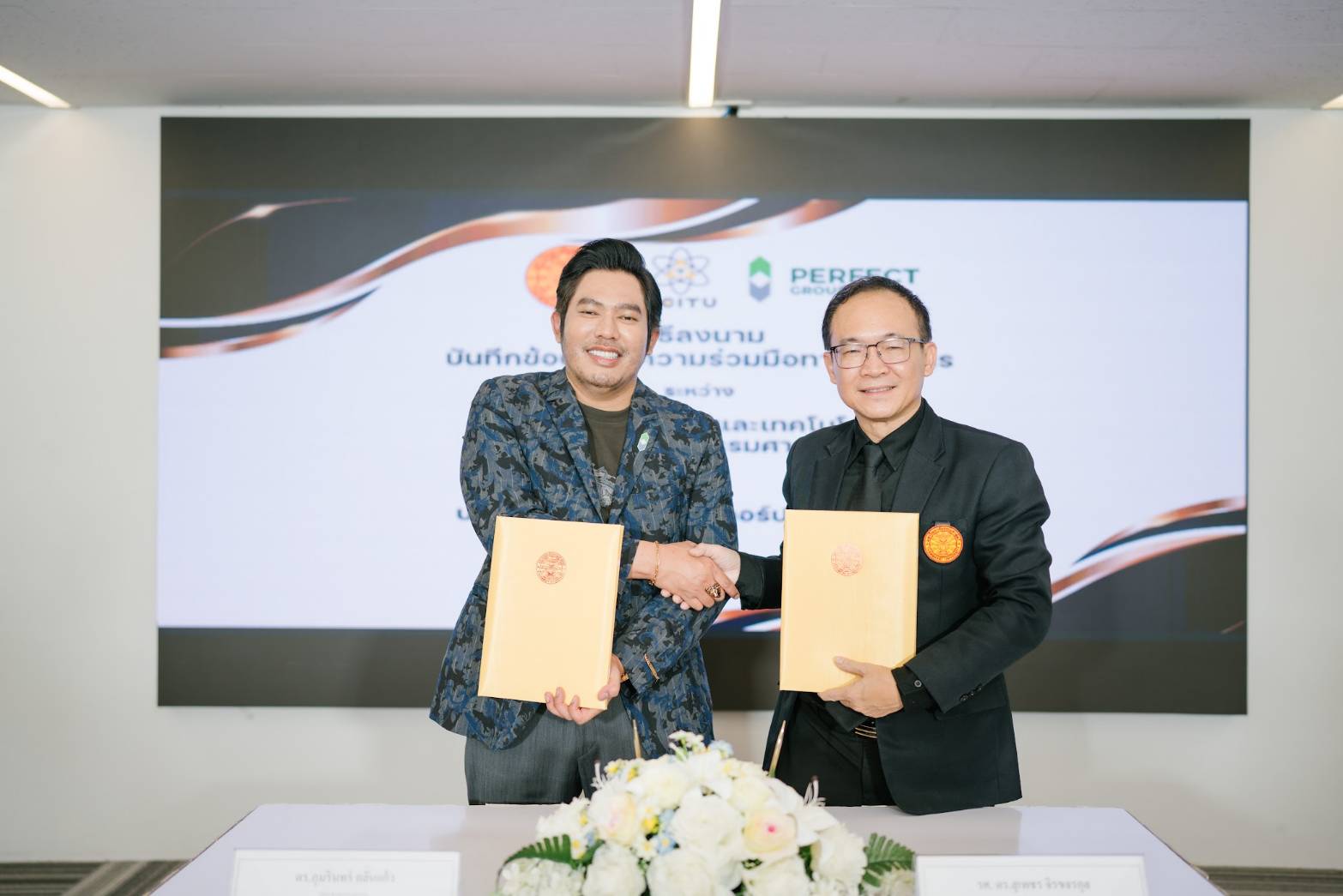 พิธีลงนามนำโดย ดร.ภุมรินทร์ กลั่นแก้ว และ ดร.ผาณิตมาส กลั่นแก้ว ประธานกลุ่มเพอร์เฟค กรุ๊ป และ รองศาสตราจารย์ ดร.สุเพชร จิรขจรกุล คณบดีคณะวิทยาศาสตร์และเทคโนโลยี มหาวิทยาลัยธรรมศาสตร์ พร้อมด้วยคณะผู้บริหารและคณาจารย์จากทั้งสองฝ่ายเข้าร่วมเป็นสักขีพยาน