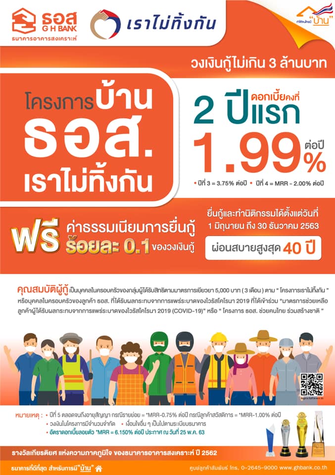 ธอส.ช่วยลูกค้าที่ได้รับผลกระทบจากโควิด-19 ผ่าน 10 มาตรการ รวม 443,220 ล้านบาท เตรียมสินเชื่ออีก 20,000 ล้านบาท สำหรับคนในครอบครัวผู้ที่ได้รับผลกระทบ ดอกเบี้ย 1.99% ต่อปี คงที่ 2 ปีแรก กับโครงการบ้าน ธอส. เราไม่ทิ้งกัน