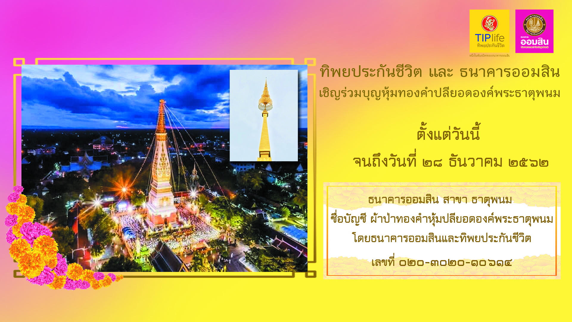 ทิพยประกันชีวิต ร่วมกับธนาคารออมสิน เชิญชวนร่วมทอดผ้าป่าทองคำหุ้มปลียอดองค์พระธาตุพนม