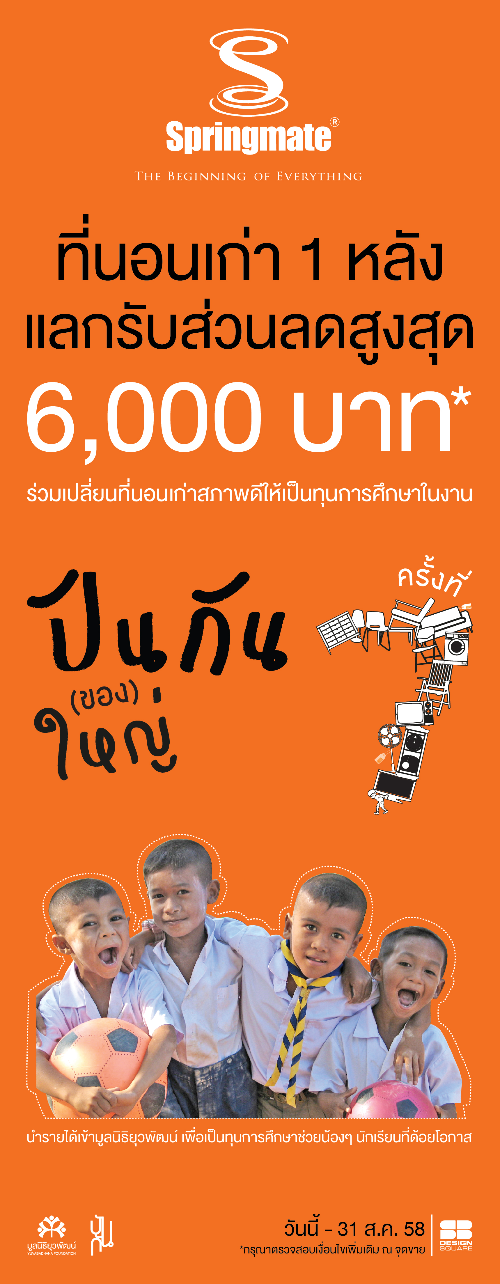 ที่นอนและเครื่องนอน สปริงเมท (Springmate) ขอเชิญทุกท่านร่วมเป็นส่วนหนึ่งของสังคมแห่งการแบ่งปันผ่านแคมเปญ “ปันกัน ... ที่นอนเก่าแลกรับส่วนลด สูงสุด 6,000 บาท” โดยสปริงเมทจะนำที่นอนเก่าสภาพดีที่ได้รับมอบให้กับ ”ร้านปันกัน” เพื่อนำไปจำหน่ายในงาน “ปันกันของใหญ่ ครั้งที่ 7” ที่จะเกิดขึ้นในช่วงเดือนกันยายน 2558 รายได้จากการจัดจำหน่ายที่นอนเก่าจะถูกนำไปเป็นทุนการศึกษาผ่าน มูลนิธิยุวพัฒน์ (Yuvabadhana Foundation) เพื่อสนับสนุนการพัฒนาเยาวชนที่ขาดโอกาสให้เป็นทรัพยากรบุคคลที่มีคุณภาพต่อไป