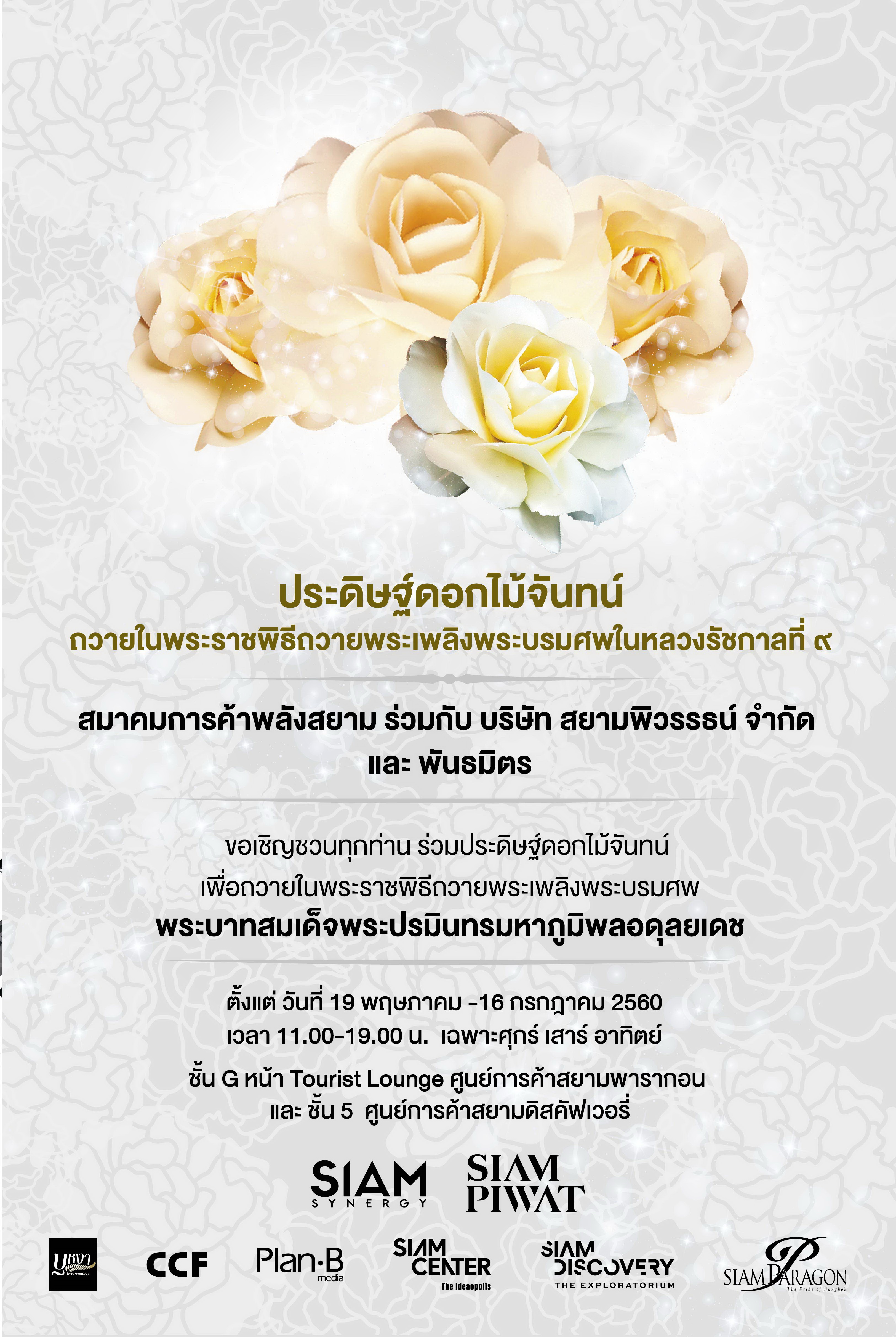 สมาคมการค้าพลังสยาม (Siam Synergy Trade Association) นำโดย บริษัท สยามพิวรรธน์ จำกัด บริษัท เอ็ม บี เค จำกัด (มหาชน) และ กลุ่มธุรกิจสยามสแควร์ ขอเชิญชวนประชาชนจิตอาสาทุกท่านร่วมประดิษฐ์ดอกไม้จันทน์ เพื่อใช้ในพระราชพิธีถวายพระเพลิงพระบรมศพพระบาทสมเด็จพระปรมินทรมหาภูมิพลอดุลยเดช โดยจัดเตรียมพื้นที่พร้อมมีผู้เชี่ยวชาญร่วมสอนวิธีประดิษฐ์ดอกไม้จันทน์ให้กับประชาชนทุกท่านตามรายละเอียดด้านล่าง