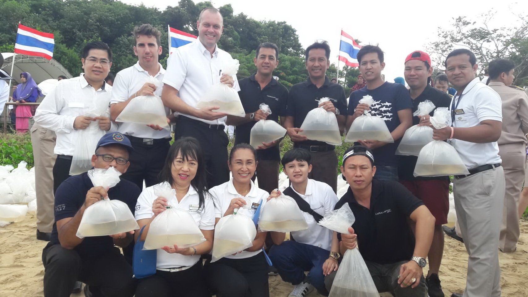 Recently, Commander of the Royal Thai Navy Third Area Command Vice Admiral Surapol Kuptaphan (4th from left) presided over the ceremony to release Aquatic Animals in honour of His Mjesty King Maha Vajiralongkorn’s 65th Birthday at the beach of the Royal Thai Navy Third Area near Cape Panwa Hotel Phuket. Cape Panwa Hotel Phuket General Manager Thomas Hain (3rd from left) and Mayor of Vichit Municipality Kreetha Chotiwichphiphat (2nd from left) were also invited to join this event. One million shrimps, 10,000 sea bass and 30 sea turtles were released into the sea on this occasion.