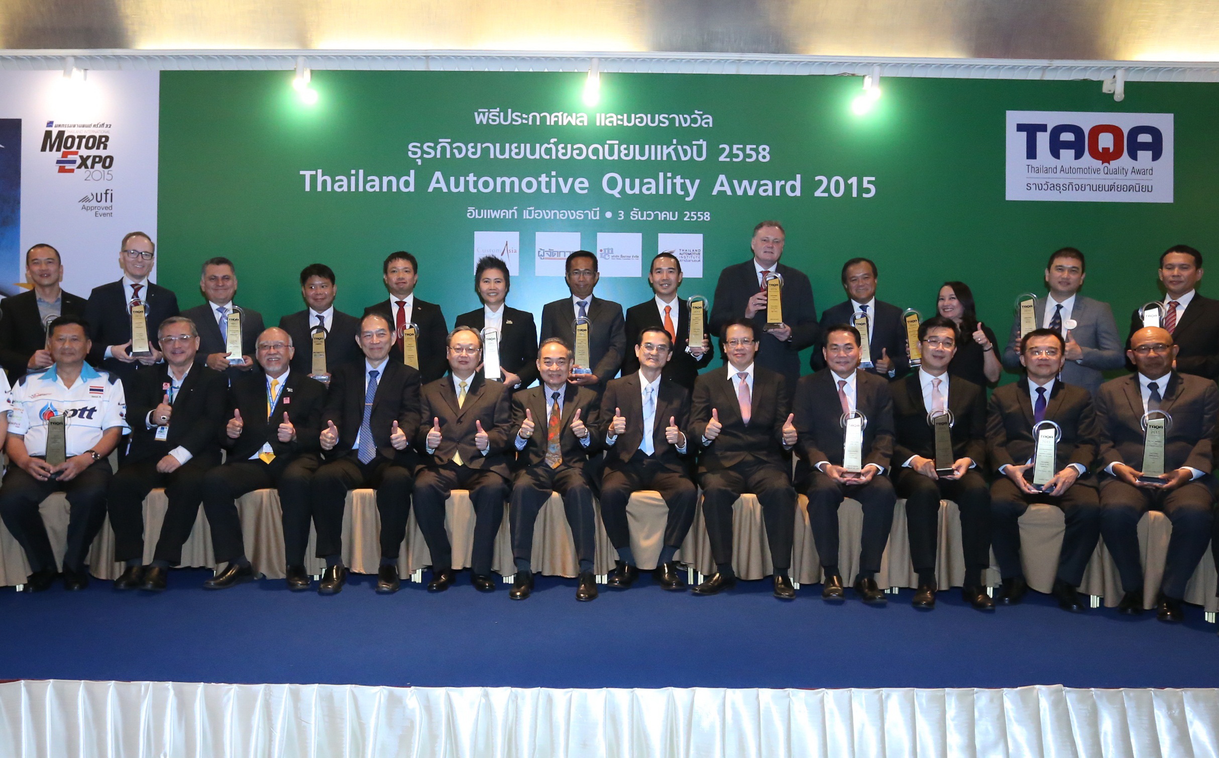 สุกิจ ตันสกุล (ที่ 6 จากซ้าย) ประธานกรรมการบริหาร บริษัท คัสต้อม เอเซีย จำกัด นายวิชัย จิราธิยุต (ที่ 4 จากซ้าย) ผู้อำนวยการสถานบันยานยนต์ และดร.สุวัฒน์ ทองธนากุล (ที่ 6 จากขวา) บรรณาธิการอำนวยการธุรกิจสื่อเครือผู้จัดการ ร่วมพิธีประกาศผลและมอบรางวัลธุรกิจยานยนต์ยอดนิยม ประจำปี 2558 หรือThailand Automotive Quality Award 2015 (TAQA) โดยมีนายขวัญชัย ปภัสร์พงษ์ (ที่ 3 จากซ้าย) ประธานจัดงานมหกรรมยานยนต์ (Motor Expo) และนายสนธิรัตน์ สนธิจิรวงศ์ (ที่ 5 จากซ้าย) ที่ปรึกษารัฐมนตรีว่าการกระทรวงอุตสาหกรรม ร่วมแสดงความยินดีกับ 13 แบรนด์ดังซึ่งประกอบด้วยบริษัทรถและผลิตภัณฑ์เกี่ยวเนื่องที่ได้รับรางวัลอันทรงเกียรติในปีนี้ ณ อาคารชาเลนเจอร์ อิมแพคท์ เมืองทองธานี