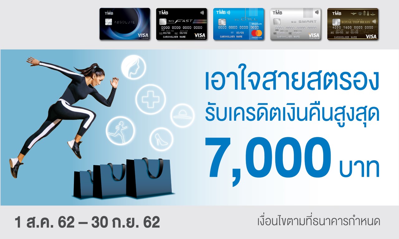 บัตรเครดิตทีเอ็มบี เอาใจสายสตรอง ให้คุณได้มากกว่า เพียงมียอดใช้จ่ายในหมวดโรงพยาบาล สถาบันเสริมความงาม แฟชั่นและอุปกรณ์กีฬา พร้อมรับเครดิตเงินคืนรวมสูงสุด 7,000 บาท ตั้งแต่ 1 ส.ค. – 30 ก.ย. 2562