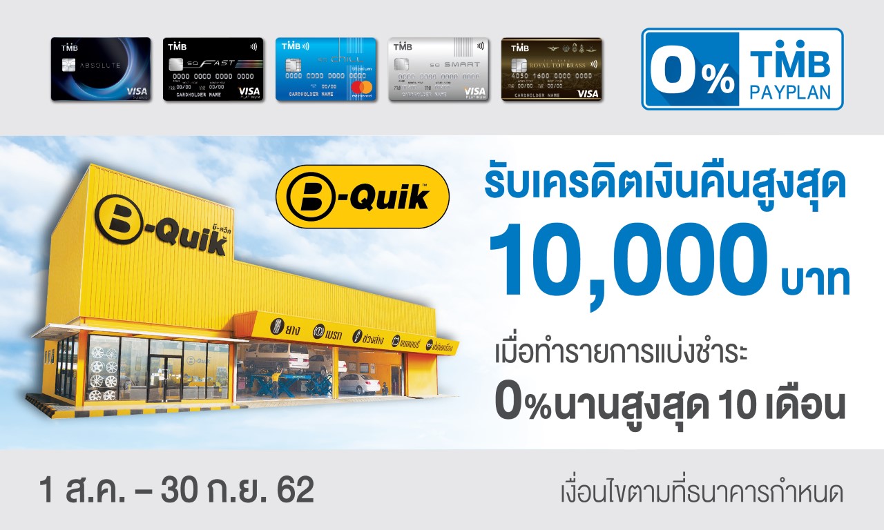บัตรเครดิตทีเอ็มบี ร่วมกับ ศูนย์บริการ บีควิก มอบสิทธิพิเศษให้คนรักรถได้มั่นใจทุกการเดินทาง เพียงใช้จ่ายผ่านบัตรเครดิต TMB ที่บีควิกทุกสาขาและมียอดผ่อนชำระกับ TMB Pay Plan 0% นานสูงสุด 10 เดือน สำหรับสินค้าที่ร่วมรายการ