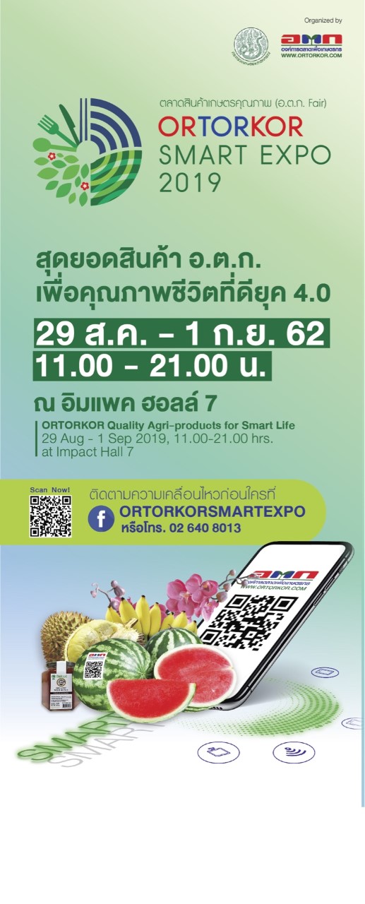 องค์การตลาดเพื่อเกษตรกร (อ.ต.ก.) โดยกระทรวงเกษตรและสหกรณ์ จัดมหกรรมสินค้าเกษตรที่ยิ่งใหญ่ที่สุดแห่งปี “ORTORKOR SMART EXPO 2019” ตลาดสินค้าเกษตรคุณภาพ (อ.ต.ก. Fair) สร้างไอคอนตลาดสดต้นแบบ รวมสุดยอดสินค้าเกษตรคุณภาพระดับประเทศ พร้อมเผยโฉมนวัตกรรม ยกระดับคุณภาพชีวิตที่ดีสู่ยุคไทยแลนด์ 4.0 ตื่นตาตื่นใจไปกับผลิตภัณฑ์สินค้าทางการเกษตรรวม 6 โซน รวม 212 บูธ นำโดย โซน Siam Orchids Centre ศูนย์รวมพันธุ์กล้วยไม้งามจากทั่วประเทศ, โซนสินค้าหัตถกรรม, โซนผักและผลไม้, โซนสินค้าแปรรูป, โซนสินค้าออแกนิค และ Food Village อาหารขึ้นชื่อรสชาติอร่อยจากทุกภาคทั่วไทย การันตีคุณภาพมาตรฐาน ระดับ Best Of Ortorkor