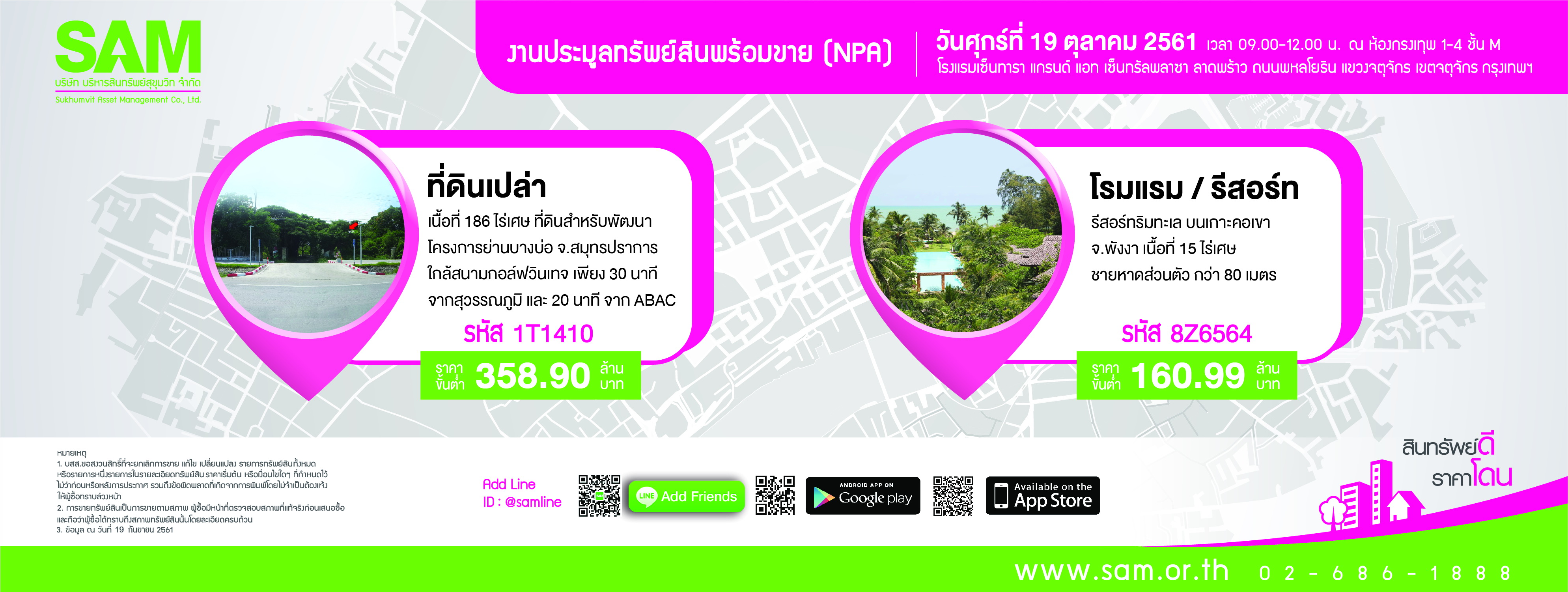 สอบถามเพิ่มเติมได้ที่ Call Center 02-686-1888 หรือดูรายละเอียดทรัพย์สินได้ที่เว็บไซต์ www.sam.or.th และแอปพลิเคชัน Sam Smile App รวมทั้งทาง Line โดยแอด ID Line @Samline”