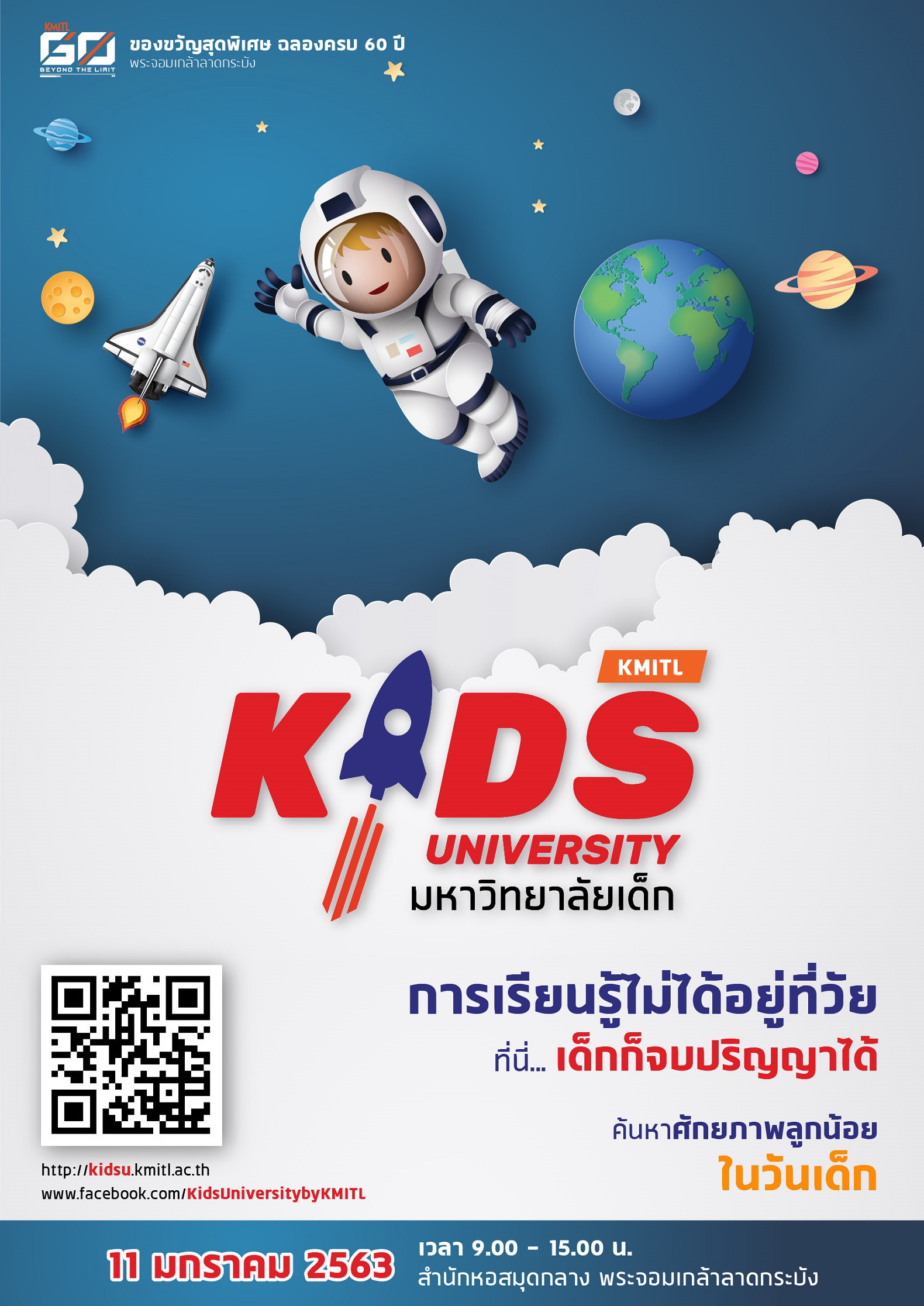 กรุงเทพฯ 3 มกราคม 2563 - สถาบันเทคโนโลยีพระเจ้าเกล้าเจ้าคุณทหารลาดกระบัง (สจล.) ฉลองครบรอบ 60 ปี เชิญชวนผู้ปกครองและน้องๆ หนูๆ เที่ยวงานวันเด็ก “Kids Dee Day 2020” ภายใต้แนวคิด “สจล. สร้างสรรค์เด็กไทย ก้าวไกลสู่สากล” ภายในงานพบกับกิจกรรมเสริมทักษะจากคณะต่างๆ รวมถึงของรางวัลมากมาย พร้อมเปิดรับสมัครเยาวชนอายุ 4-12 ปี เข้าร่วมโครงการ “มหาวิทยาลัยเด็ก” (Kids University by KMITL) กิจกรรมเสริมศักยภาพเด็กในการเตรียมความพร้อมด้านวิทยาศาสตร์และเทคโนโลยีเพื่อก้าวสู่รั้วมหาวิทยาลัย ในวันเสาร์ ที่ 11 มกราคม 2563 เวลา 09.00 - 16.30 น. ณ บริเวณชั้น 1 อาคารเฉลิมพระเกียรติ สำนักหอสมุดกลาง สถาบันเทคโนโลยีพระเจ้าเกล้าเจ้าคุณทหารลาดกระบัง กรุงเทพฯ