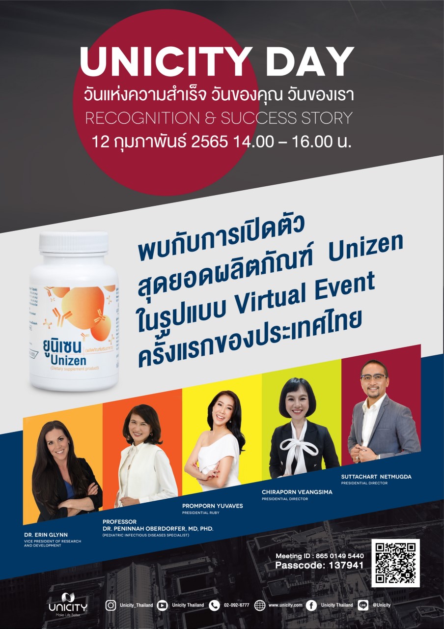 บริษัท ยูนิซิตี้ มาร์เก็ตติ้ง (ไทยแลนด์) จำกัด พร้อมเปิดประสบการณ์ใหม่ในงาน ยูนิซิตี้ เดย์ (Unicity Day) กับออนไลน์อีเวนท์เพื่อเผยโฉมนวัตกรรมผลิตภัณฑ์ใหม่ที่ได้รับการยกย่องให้เป็นหนึ่งในสุดยอดผลิตภัณฑ์แห่งปี ‘ยูนิเซน (Unizen)’ ในรูปแบบ Virtual Event ครั้งแรกในประเทศไทย พร้อมร่วมแสดงความยินดีกับเหล่านักธุรกิจยูนิซิตี้ที่โชว์ศักยภาพ คว้าตำแหน่งใหม่มาครองด้วยความภาคภูมิ และรับฟังวิสัยทัศน์เพื่อสร้างแรงบันดาลใจให้ฝ่าวิกฤติสู่ความสำเร็จกับ 2 ผู้บริหารยูนิซิตี้ อินเตอร์เนชั่นแนล นำโดย มร. คริสโตเฟอร์ คิม ประธานบริหาร, และ มร. จอห์น เฮ็ดจ์ ผู้อำนวยการฝ่ายขายระดับภูมิภาคประจำประเทศไทย ลาว พม่า ตลอดจนร่วมเปิดโลกแห่งความรู้กับเหล่านักวิชาการชั้นนำด้านเทคโนโลยีเพื่อสุขภาพ และยังมีนักธุรกิจทั้ง 3 ท่านที่จะมาร่วมแชร์ประสบการณ์และมุมมองของการขยายธุรกิจผลิตภัณฑ์ยูนิเซน ในวันเสาร์ที่ 12 กุมภาพันธ์ 2565 เวลา 14.00-16.00 น. ผ่านระบบ zoom (สามารถสแกน QR code เพื่อเข้าร่วมได้)