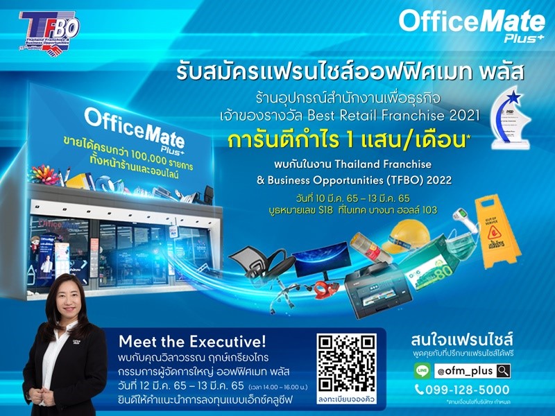 ออฟฟิศเมท พลัส ในเครือเซ็นทรัล รีเทล เจ้าของรางวัลสุดยอดแฟรนไชส์ไทยค้าปลีกยอดเยี่ยมแห่งปี “Best Retail Franchise 2021” เดินหน้าเปิดรับสมัครผู้ประกอบการรุ่นใหม่ไฟแรงจากทุกภูมิภาคทั่วไทยมาร่วมลงทุนและเติบโตไปด้วยกัน เราพร้อมให้คุณเป็นเจ้าของร้านสะดวกซื้ออุปกรณ์สำนักงานเพื่อธุรกิจได้ไวใน 3 เดือน และขายสินค้าจากแบรนด์ชั้นนำได้ครบครันกว่าแสนรายการ สร้างรายได้ทั้งจากหน้าร้านและการขายระบบออนไลน์หลังร้านโดยไม่ต้องห่วงสต็อค #การันตีกำไรขั้นต้น 1 แสนบาท/เดือน* (ตามเงื่อนไขที่บริษัทฯ กำหนด) ร่วมพูดคุยกับ ที่ปรึกษาแฟรนไชส์ออฟฟิศเมท พลัส ที่บูธ S18 ในงาน Thailand Franchise & Business Opportunities 2022 (TFBO) ไบเทค บางนา 10 มี.ค. 65 – 13 มี.ค. 65