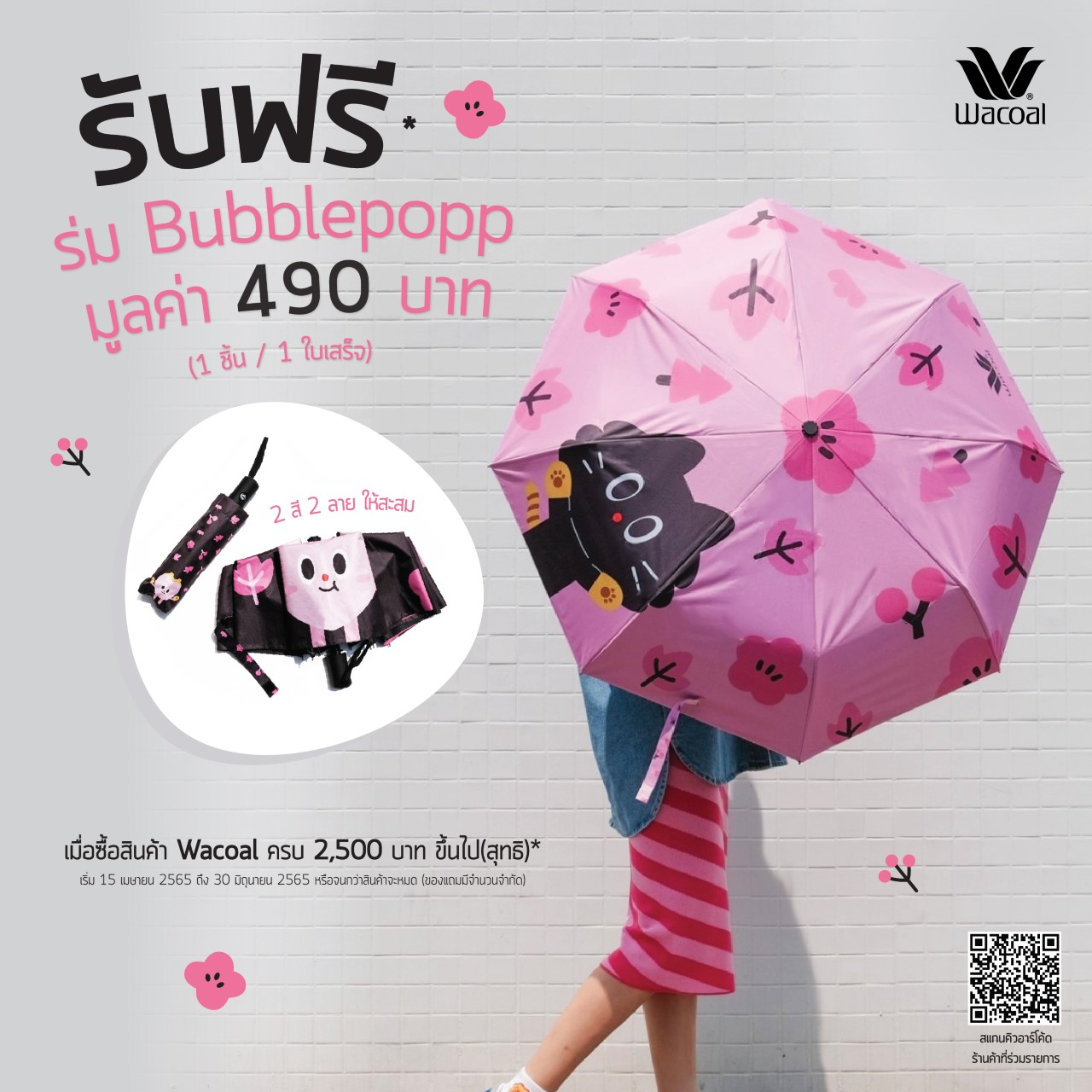 ปลายฤดูร้อนขยับสู่หน้าฝนที่ปนไปด้วยความน่ารัก กับโปรโมชันสุดพิเศษที่อยู่กับคุณทุกฤดู เพียงซื้อสินค้าวาโก้ 2,500 บาท (สุทธิ) ขึ้นไปต่อใบเสร็จ รับฟรีร่มสุดคิ้วท์ลิมิเต็ดอิดิชั่น ลายการ์ตูน Bubblepopp จำนวน 1 ชิ้น มูลค่า 490 บาท โดยมี 2 สี (สีชมพู, สีดำ) และ 2 ลวดลายให้เลือกสะสม (สงวนสิทธ์ 1 คนต่อ 1 สิทธิ์) ร่ม Bubblepopp สามารถป้องกันรังสียูวีจากแสงแดด กันฝนทนลมแรง พับเก็บง่ายพกพาสะดวก โปรโมชันแถมฟรีที่เลือกเฉพาะของพรีเมี่ยมดีๆ มีจำนวนจำกัด เริ่มวันที่ 15 เมษายน 2565 – 30 มิถุนายน 2565 (หรือจนกว่าสินค้าจะหมด) ณ วาโก้ช็อปและเคาน์เตอร์วาโก้ สาขาที่ร่วมรายการ *เงื่อนไขเป็นไปตามที่บริษัทฯ กำหนด ข้อมูลเพิ่มเติมที่ Call Center 02-296-9979
