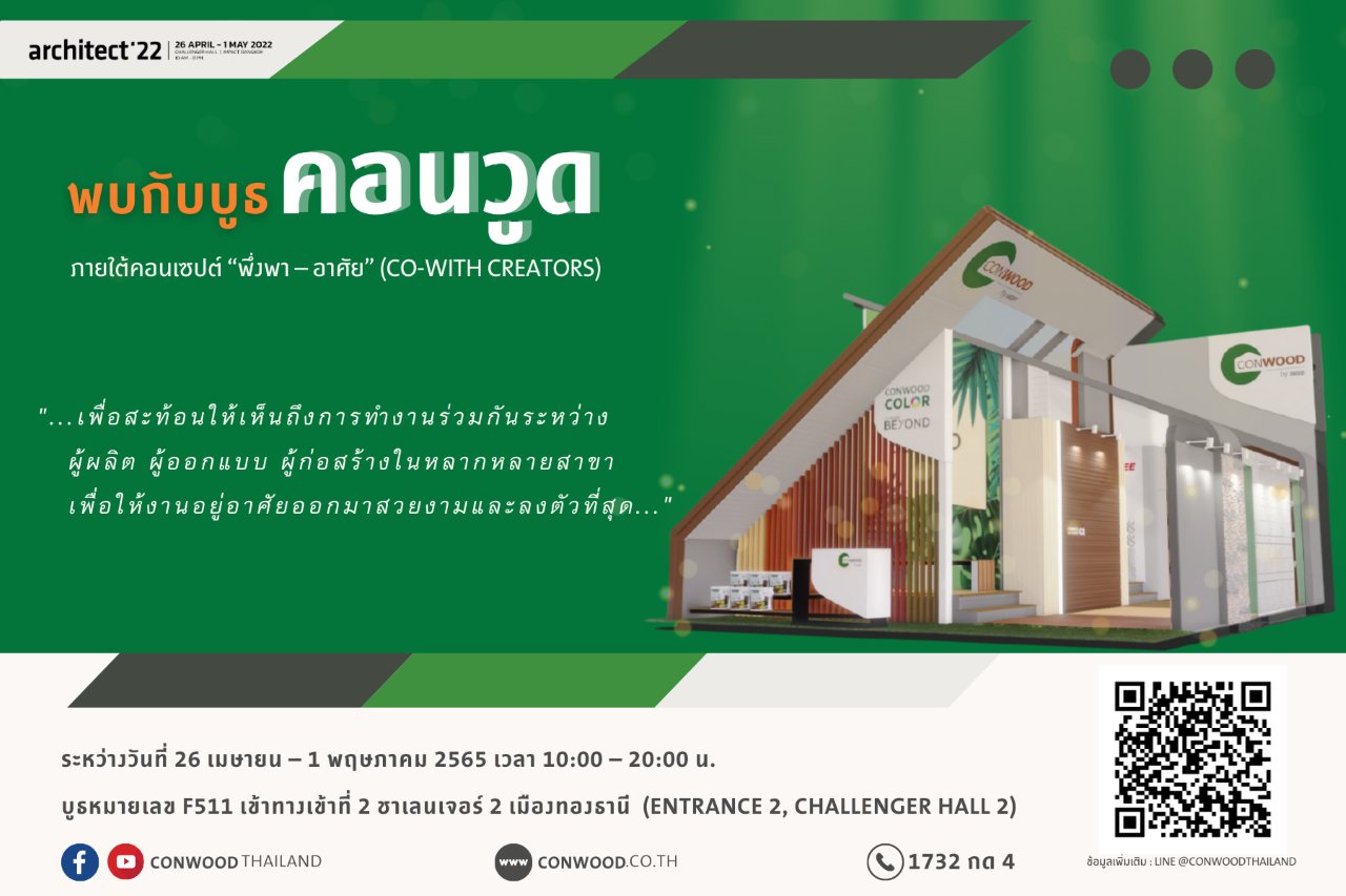 ภายในบูธตกแต่งภายใต้คอนเซปต์ “พึ่งพา-อาศัย (Co-with Creators)” แสดงให้เห็นถึงการทำงานร่วมกันของผู้ผลิต สถาปนิก มัณฑนากร ผู้ออกแบบด้านต่าง ๆ และผู้ก่อสร้าง เพื่อให้ได้งานก่อสร้างที่ตอบโจทย์ด้านความสวยงามและยกระดับมาตรฐานการอยู่อาศัยที่ดีขึ้นของทุกคน พร้อมชูเทคโนโลยี ดิจิทอล โค้ทติ้ง ที่ให้สีสวย ทนทาน ด้วยการทำสีและเคลือบถึง 5 ชั้น และเทคโนโลยีคัลเลอร์ โค้ทติ้ง ซึ่งเป็นสีสำเร็จบนผลิตภัณฑ์คอนวูด ช่วยให้ทุกงานตกแต่งสวย สะดวก รวดเร็ว และคุณภาพสม่ำเสมอ นอกจากนั้น ยังมีผลิตภัณฑ์ใหม่ ๆ ยกทัพมาเปิดตัวอีกมากมาย บนพื้นที่จัดแสดงสินค้ากว่า 63 ตารางเมตร