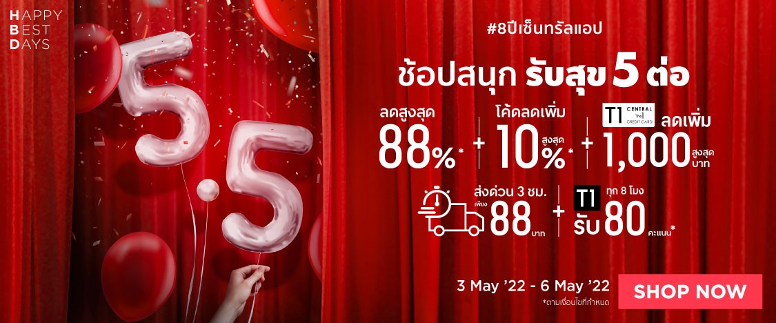 ห้างเซ็นทรัล ประเดิมเซอร์ไพรส์แรกฉลองเดือนเกิด 8 ปี Central App (เซ็นทรัลแอป) ด้วยแคมเปญ “Central App 5.5 Birthday” ช้อปสนุกรับสุข 5 ต่อ ระหว่างวันที่ 3 พ.ค. 65 – 6 พ.ค. 65 บนแอปพลิเคชั่น Central App และเว็บไซต์ www.central.co.th ชวนคุณมาช้อปเรียกน้ำย่อยคว้าไอเทมแบรนด์ดัง พร้อมโปรโมชั่นและบริการสุดพิเศษ 5 ต่อ ได้แก่
