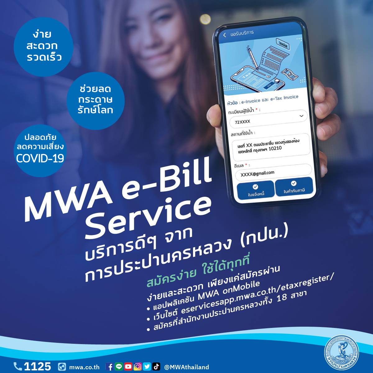 การประปานครหลวง แนะนำ MWA e-Bill Service บริการเอกสารในรูปแบบอิเล็กทรอนิกส์ ประกอบด้วย