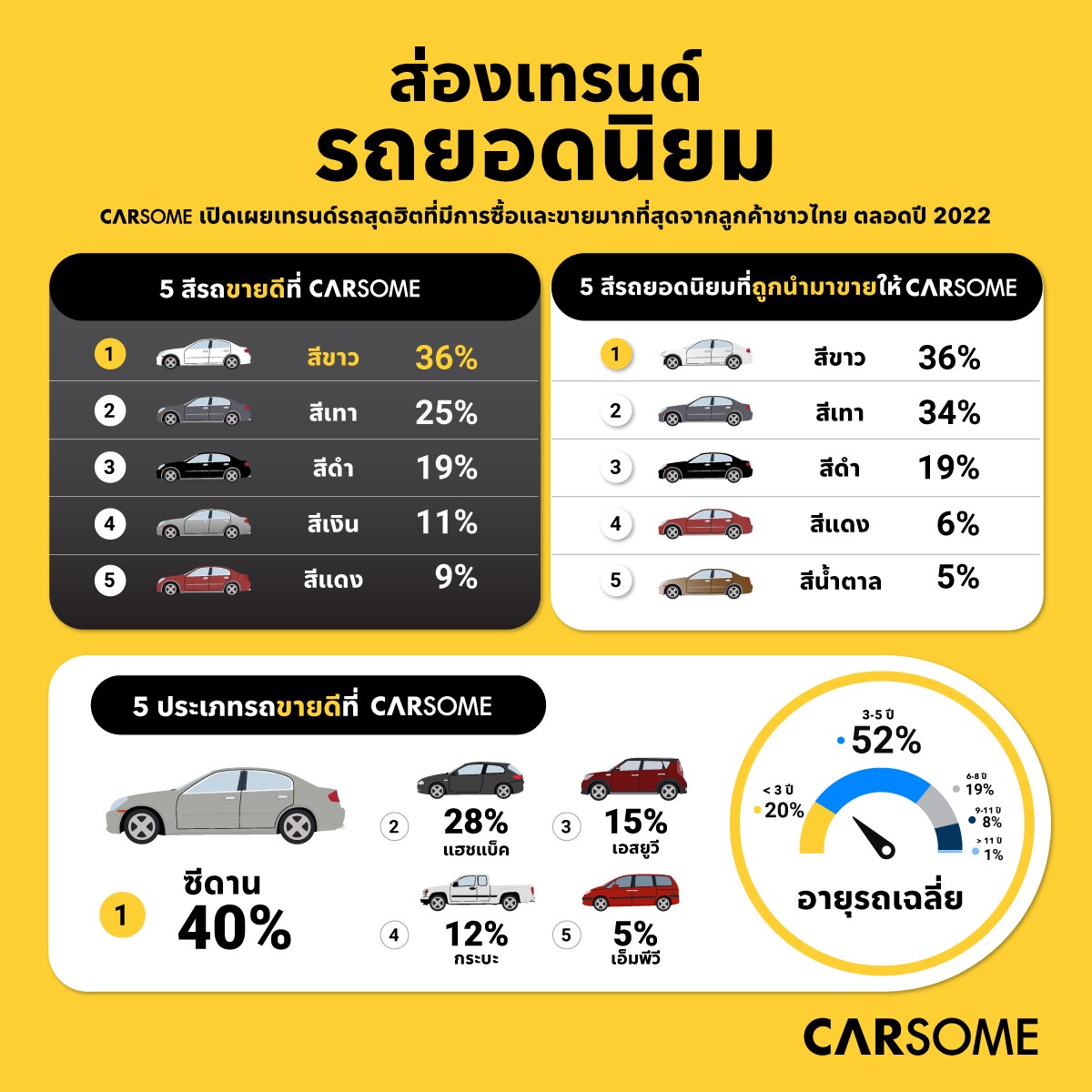 ข้อมูลจาก CARSOME เผย 36% ของลูกค้าในปี 2565 เลือกซื้อรถยนต์สีขาว ในขณะที่ 40% เลือกซื้อรถยนต์ประเภทซีดาน