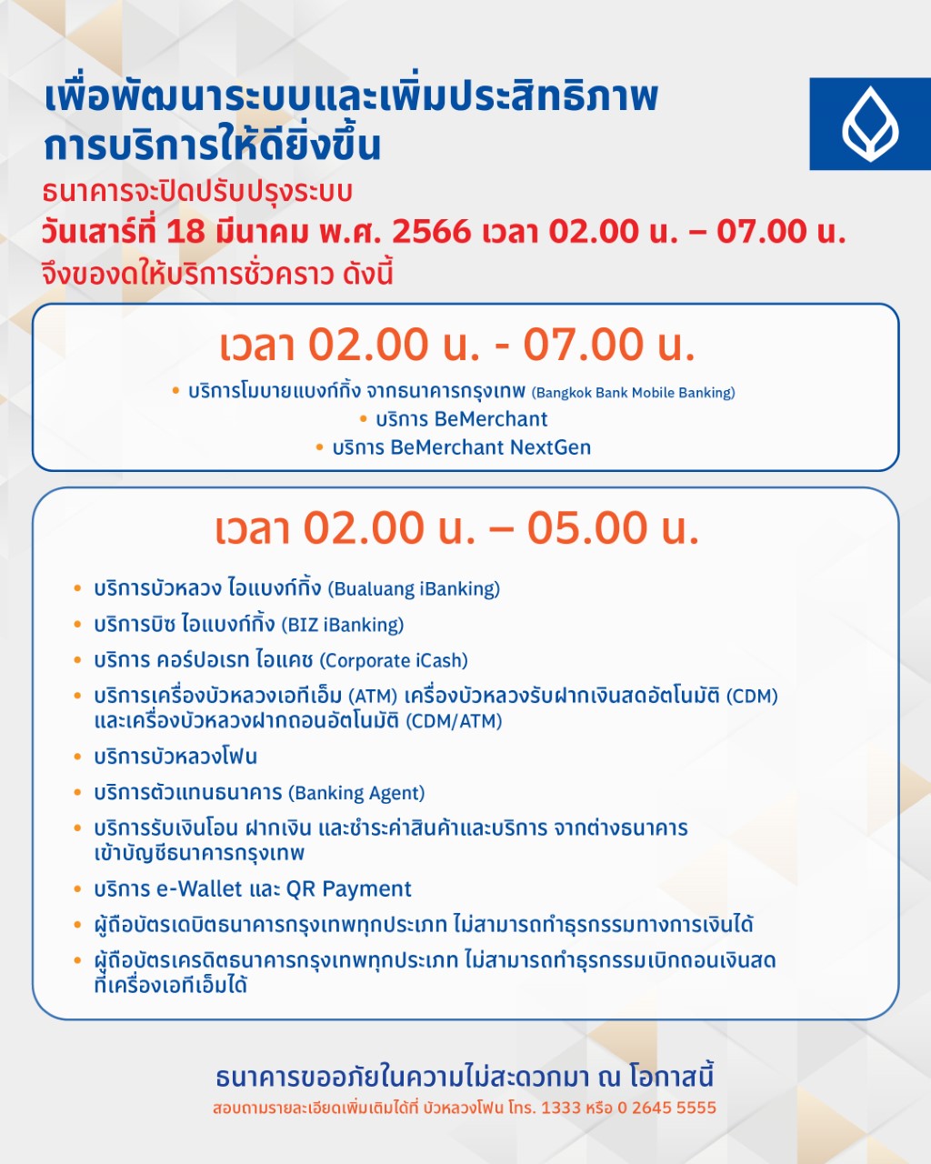 ธนาคารกรุงเทพ จำกัด (มหาชน) แจ้งขออภัยในความไม่สะดวก กรณีขอปิดปรับปรุงระบบงานอิเล็กทรอนิกส์ชั่วคราว เพื่อพัฒนาและเพิ่มประสิทธิภาพการบริการให้ดียิ่งขึ้น ในเช้าวันเสาร์ที่ 18 มีนาคม พ.ศ. 2566 เวลา 02.00 น. – 07.00 น. ซึ่งจะส่งผลให้ลูกค้าของธนาคารและลูกค้าต่างธนาคาร ไม่สามารถใช้บริการทำธุรกรรมในวันและช่วงเวลาที่กำหนดได้ ตามรายละเอียด ดังนี้