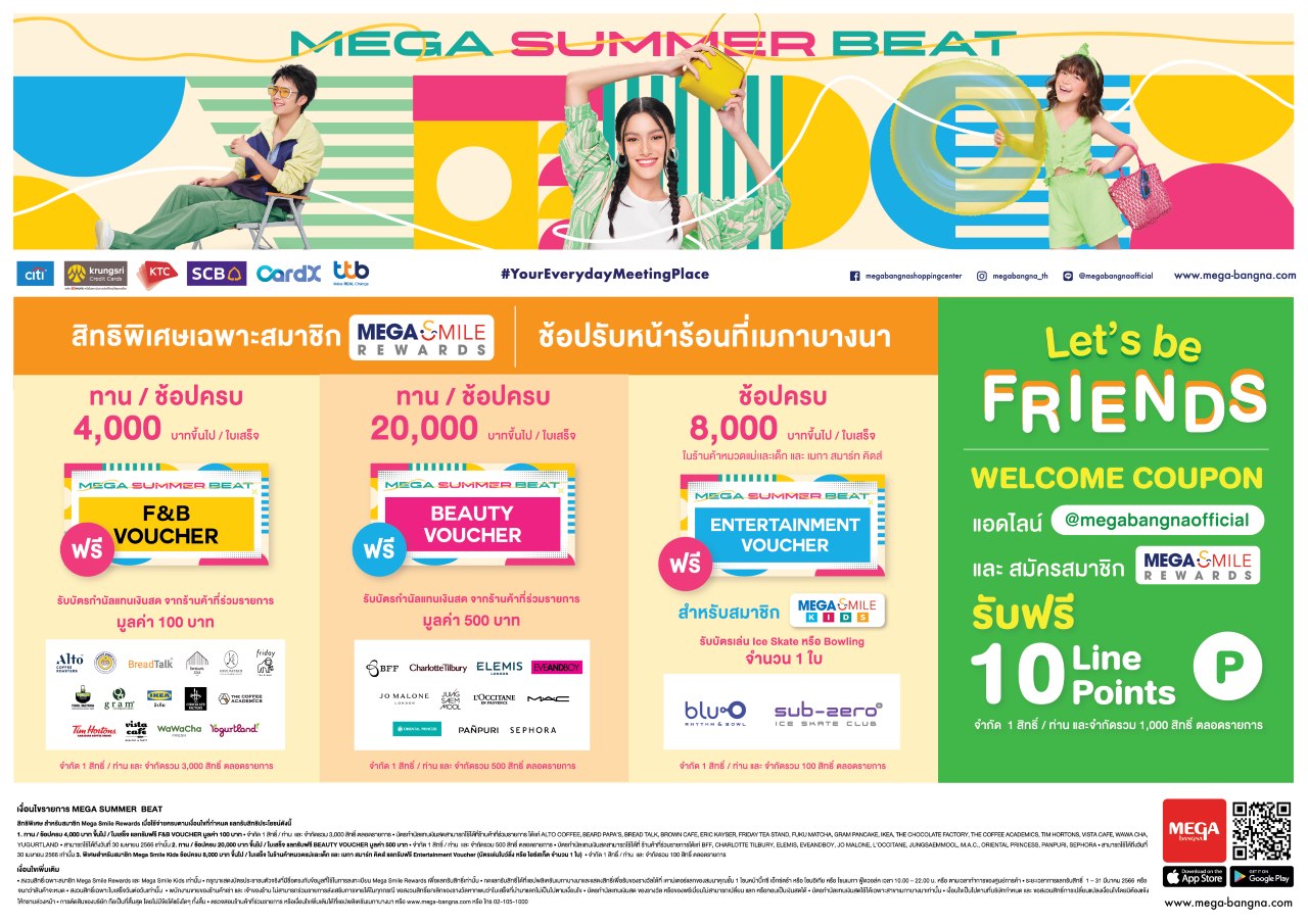 ศูนย์การค้าเมกาบางนา ส่งแคมเปญให้คุณได้เติมเต็มทุกจังหวะการช้อปของคุณให้สนุกมากขึ้น ช้อปคอลเลคชั่นใหม่รับซัมเมอร์นี้กับแคมเปญ “MEGA SUMMER BEAT” ตั้งแต่วันที่ 1 – 31 มีนาคม 2565 จัดเต็มสิทธิพิเศษเฉพาะลูกค้าที่ช้อปกับร้านค้าภายในศูนย์การค้าเมกาบางนากว่า 900 ร้าน พร้อมรับสิทธิพิเศษเพิ่มเติมจากร้านค้าที่ร่วมรายการสำหรับสมาชิกเมกา สไมล์ รีวอร์ดส และ เมกา สไมล์ คิดส์ เท่านั้น คุ้มจุใจทั้งบัตรกำนัลเงินสด ของพรีเมี่ยมสุดเอ็กซ์คลูซีพ เมื่อทาน / ช้อปครบตามเงื่อนไขที่กำหนด ได้แก่