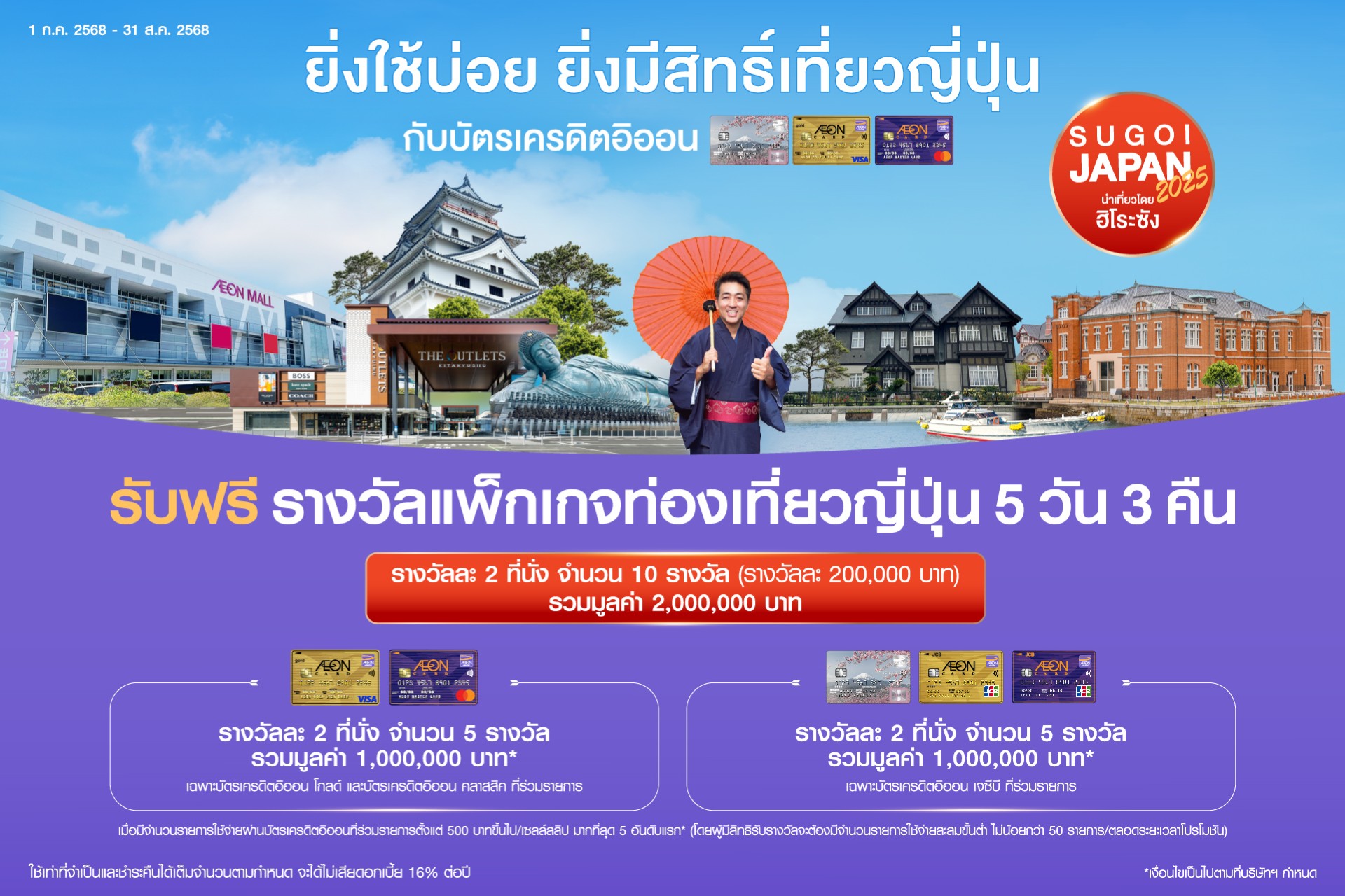 กรุงเทพฯ, ประเทศไทย – วันที่ 31 กรกฎาคม 2568 –บริษัท อิออน ธนสินทรัพย์ (ไทยแลนด์) จำกัด (มหาชน) ตอกย้ำความเป็นตัวจริงเรื่องเที่ยวญี่ปุ่น พร้อมเปิดตัวแคมเปญ “SUGOI JAPAN 2025 by AEON” ที่ปีนี้พร้อมพาลูกค้าคนพิเศษของอิออนไปสัมผัสมนต์เสน่ห์แดนใต้ของญี่ปุ่น ณ เกาะคิวชู จัดเต็มทั้งบัตรโดยสารการบินไทยและที่พัก พร้อมตะลุยกิน เที่ยว ชอป แบบสุโก้ย แพกเก็จมูลค่ารวมกว่าสองล้านบาท สิทธิพิเศษ ๆ แบบนี้ สำหรับ 10 ท่าน* ที่มีจำนวนยอดใช้จ่ายมากที่สุดผ่านบัตรเครดิตอิออนที่ร่วมรายการ ณ ร้านค้าทั่วโลก ตามเงื่อนไขที่กำหนด* ตั้งแต่วันนี้ ถึงวันที่ 31 สิงหาคม 2568