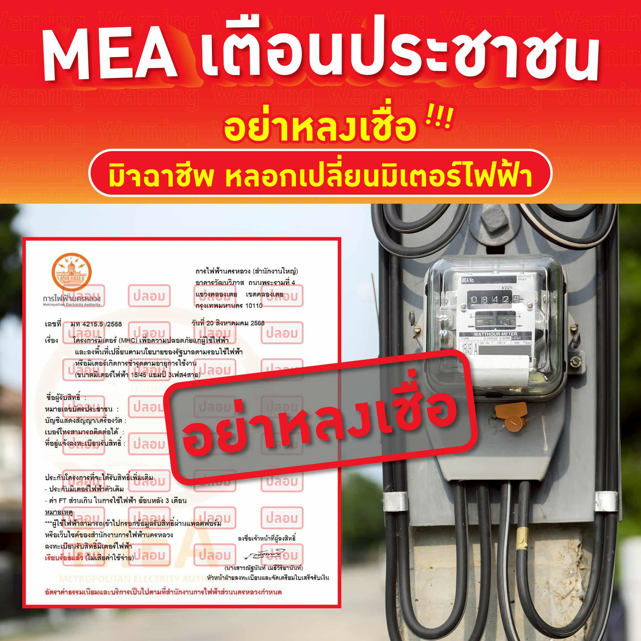 MEA หรือการไฟฟ้านครหลวง แจ้งเตือนประชาชนว่าปัจจุบันมีมิจฉาชีพแอบอ้าง MEA เพื่อหลอกลวงเปลี่ยนมิเตอร์ ภายใต้ชื่อโครงการมิเตอร์ เพื่อความปลอดภัยแก่ผู้ใช้ไฟฟ้า และลงพื้นที่เปลี่ยนตามนโยบายของรัฐบาลตามรอบใช้ไฟฟ้า หรือมิเตอร์เกิดการชำรุดตามอายุการใช้งาน MEA ขอชี้แจงว่าไม่มีโครงการดังกล่าว โดยขอให้ประชาชนระมัดระวังกลุ่มมิจฉาชีพหลอกลวงผู้ใช้ไฟฟ้า รวมถึงการโทรหลอกบริการเปลี่ยนมิเตอร์ไฟฟ้าฟรี หรือหลอกลวงให้กดลิงก์ และขอข้อมูลผ่านทาง Line หากประชาชนหลงเชื่อกดลิงก์ และให้ข้อมูลจะมีความเสี่ยงทำให้เสียทรัพย์ได้
