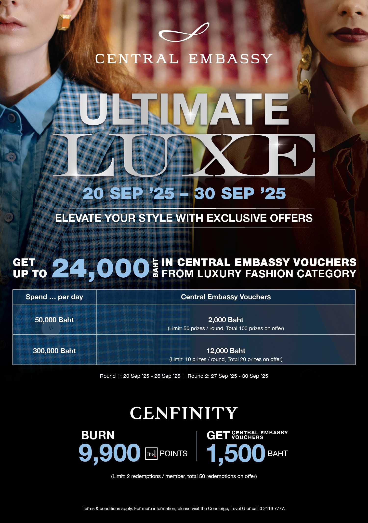 เพื่อเติมเต็มประสบการณ์ที่สมบูรณ์แบบ พบกับข้อเสนอสุดพิเศษ รับ Central Embassy Voucher รวมสูงสุด 24,000 บาท เมื่อช้อปสินค้าในหมวด Luxury Fashion ครบตามเงื่อนไข (ยกเว้น Luxury Watch & Jewelry) โดยสามารถรวมใบเสร็จจากร้านค้าที่ร่วมรายการได้ภายในวันเดียวกัน ทั้งนี้ ข้อเสนอดังกล่าวมีจำนวนจำกัดและแบ่งเป็น 2 รอบ ได้แก่ รอบแรก วันที่ 20 – 26 ก.ย. 68 และรอบที่สอง วันที่ 27 – 30 ก.ย. 68