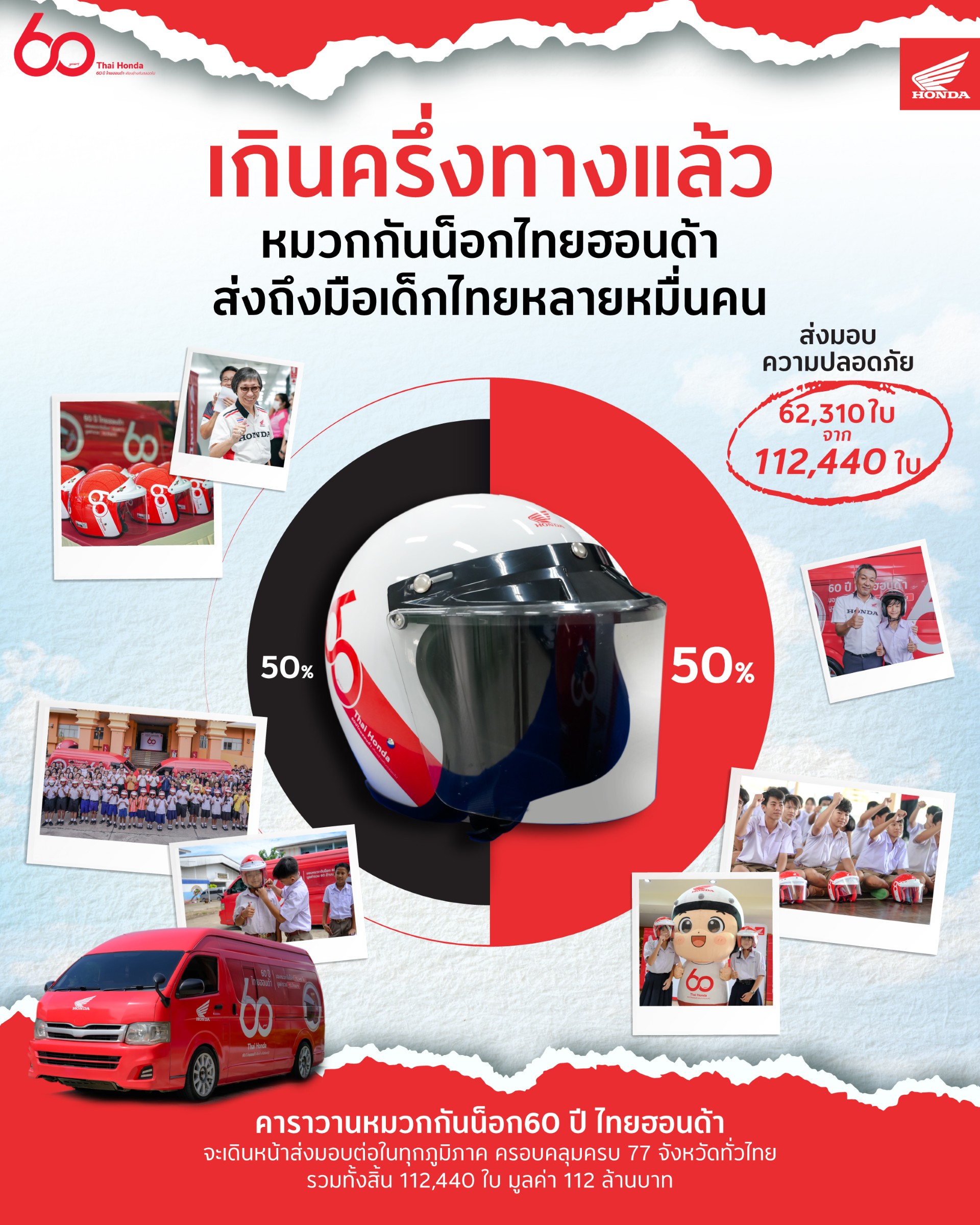 ไทยฮอนด้า ผู้ผลิตและจัดจำหน่ายรถจักรยานยนต์และเครื่องยนต์อเนกประสงค์ฮอนด้าในประเทศไทย เดินหน้าส่งต่อความห่วงใยสู่สังคมไทยในวาระครบรอบ 60 ปี ภายใต้โครงการรณรงค์ความปลอดภัยทางถนนระดับประเทศ “60 ปี ไทยฮอนด้า ขับขี่ปลอดภัย เพื่อสังคมไทยที่ยั่งยืน” ล่าสุด คาราวานหมวกกันน็อกไทยฮอนด้า ได้เดินทางมาถึง “ครึ่งทาง” ของภารกิจแล้ว ด้วยการส่งมอบหมวกนิรภัยมาตรฐาน มอก. จำนวน 62,310 ใบ จากเป้าหมายใหญ่ 112,440 ใบ สู่เยาวชนและประชาชนใน 50 จังหวัดทั่วประเทศ