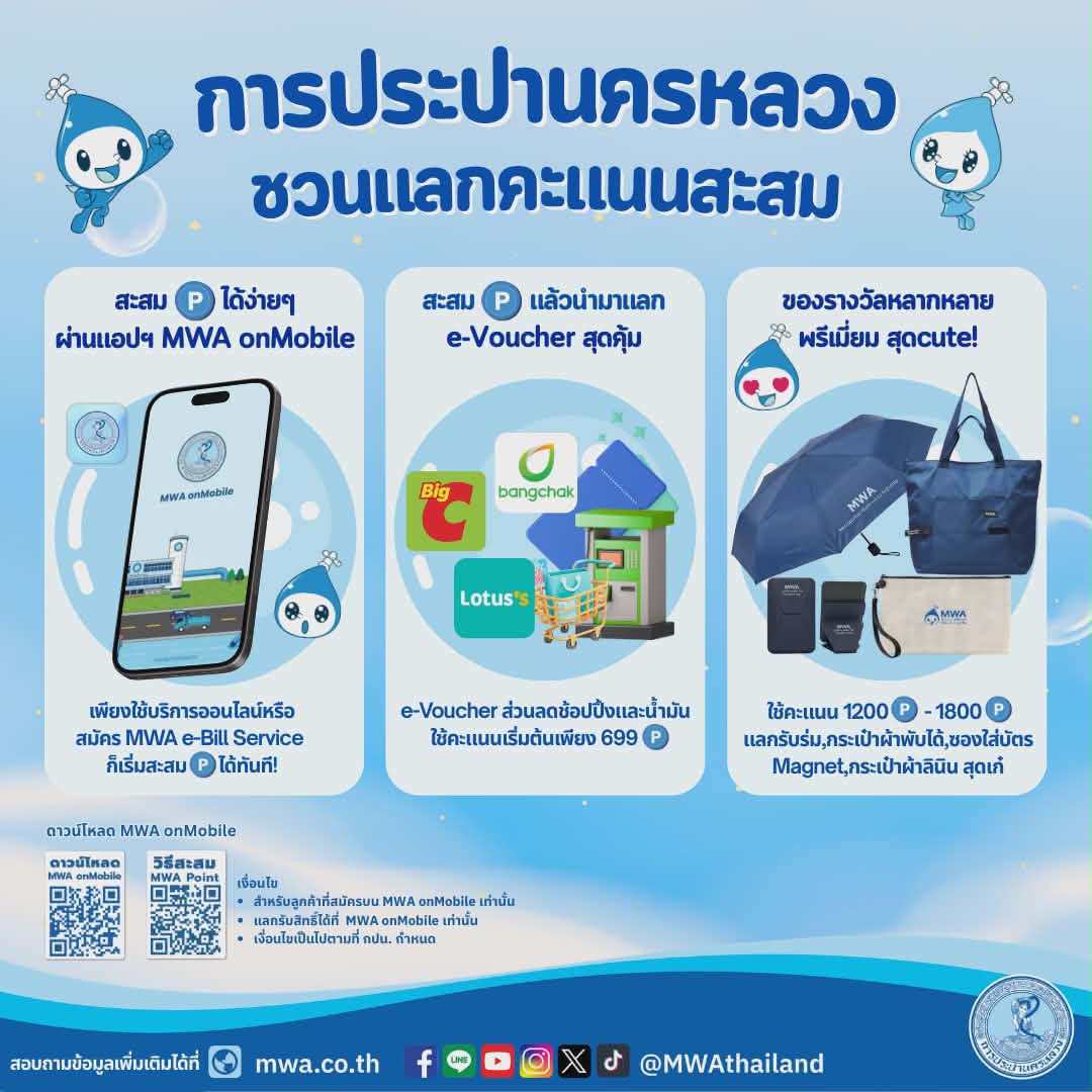 การกระปานครหลวง ชวนแลกคะแนนสะสม เพียงใช้บริการออนไลน์หรือสมัคร MWA e-Bill Service ผ่านแอป MWA onMobile รับทันที MWA Point สะสมและแลกรับของรางวัลมากมาย ไม่ว่าจะเป็น e-Voucher หรือของที่ระลึกสุดพิเศษ (อาทิ กระเป๋า, ร่ม, ซองใส่บัตร Magnet) เริ่ม 16 มี.ค. 69 ตั้งแต่เวลา 10.00 น. เป็นต้นไป จนกว่าของจะหมด (สินค้ามีจำนวนจำกัด)