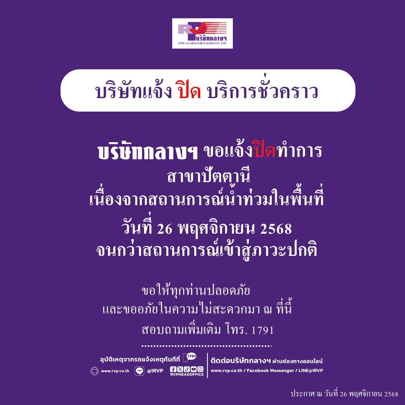 ประกาศปิดให้บริการชั่วคราว บริษัท กลางคุ้มครองผู้ประสบภัยจากรถ จำกัด สาขาปัตตานี เนื่องจากสถานการณ์น้ำท่วม