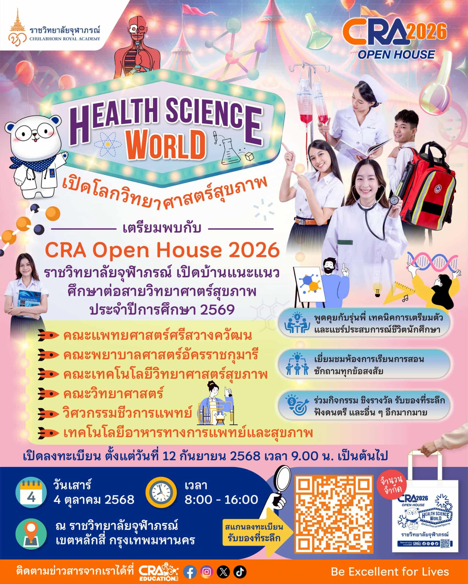 CRA Open House 2026 ราชวิทยาลัยจุฬาภรณ์ เปิดบ้านแนะแนวศึกษาต่อสายวิทยาศาสตร์สุขภาพ ประจำปีการศึกษา 2569