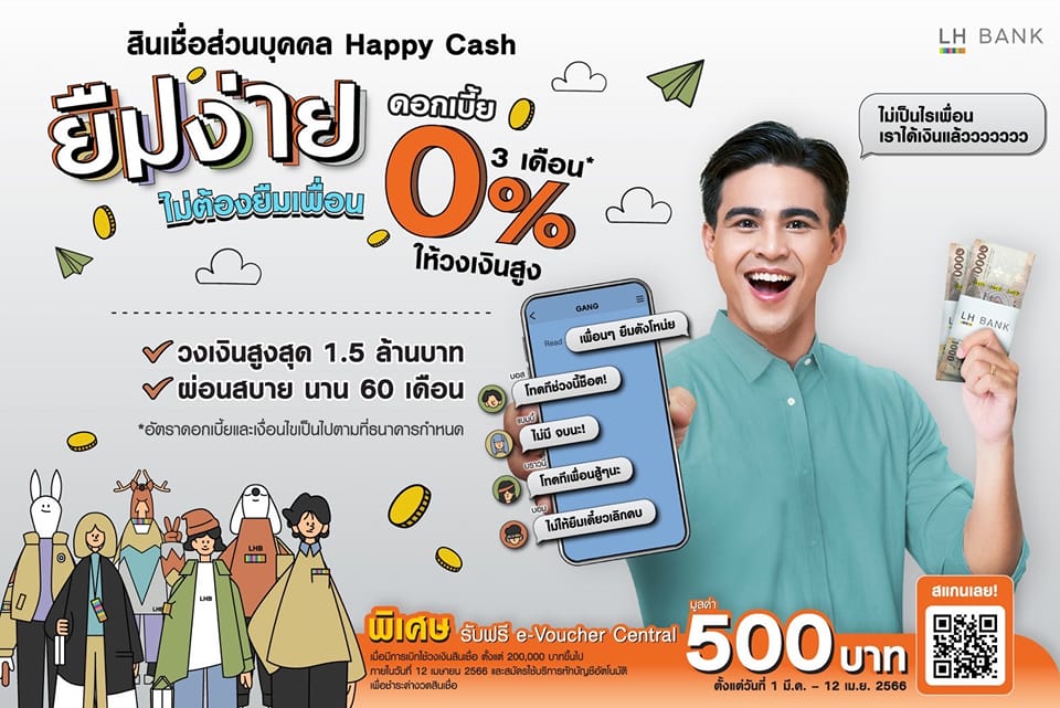 LH Bank ออกแคมเปญสินเชื่อส่วนบุคคล Happy Cash ชูดอกเบี้ย 0% นาน 3 เดือน อนุมัติเร็ว รับเงินไว ไม่ต้องค้ำประกัน
