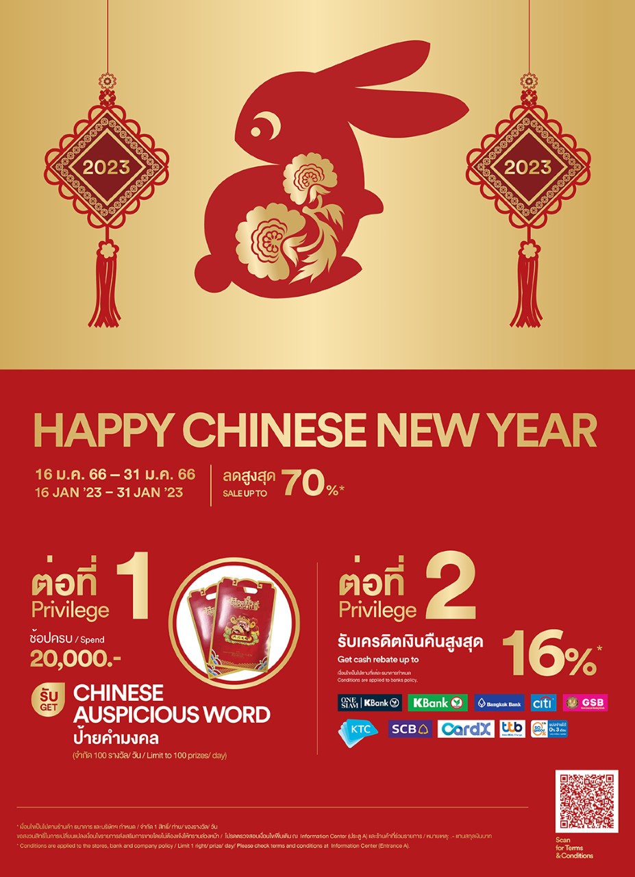 สยาม พรีเมี่ยม เอาท์เล็ต กรุงเทพ ชวนช้อปเสริมเฮงรับตรุษจีน ส่งแคมเปญ “Happy Chinese New Year” ต้อนรับปีกระต่าย ช้อปครบ 20,000 บาท รับป้ายคำมงคลเสริมดวง พร้อมเครดิตเงินคืนสูงสุด 16% ถึง 31 ม.ค. 66 นี้